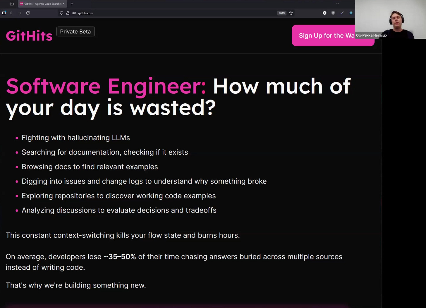 During the Q&A, Olli-Pekka elaborated on the technical architecture. He explained that while the underlying GitHub search API is primarily keyword-based, GitHits layers semantic understanding on top of it.
