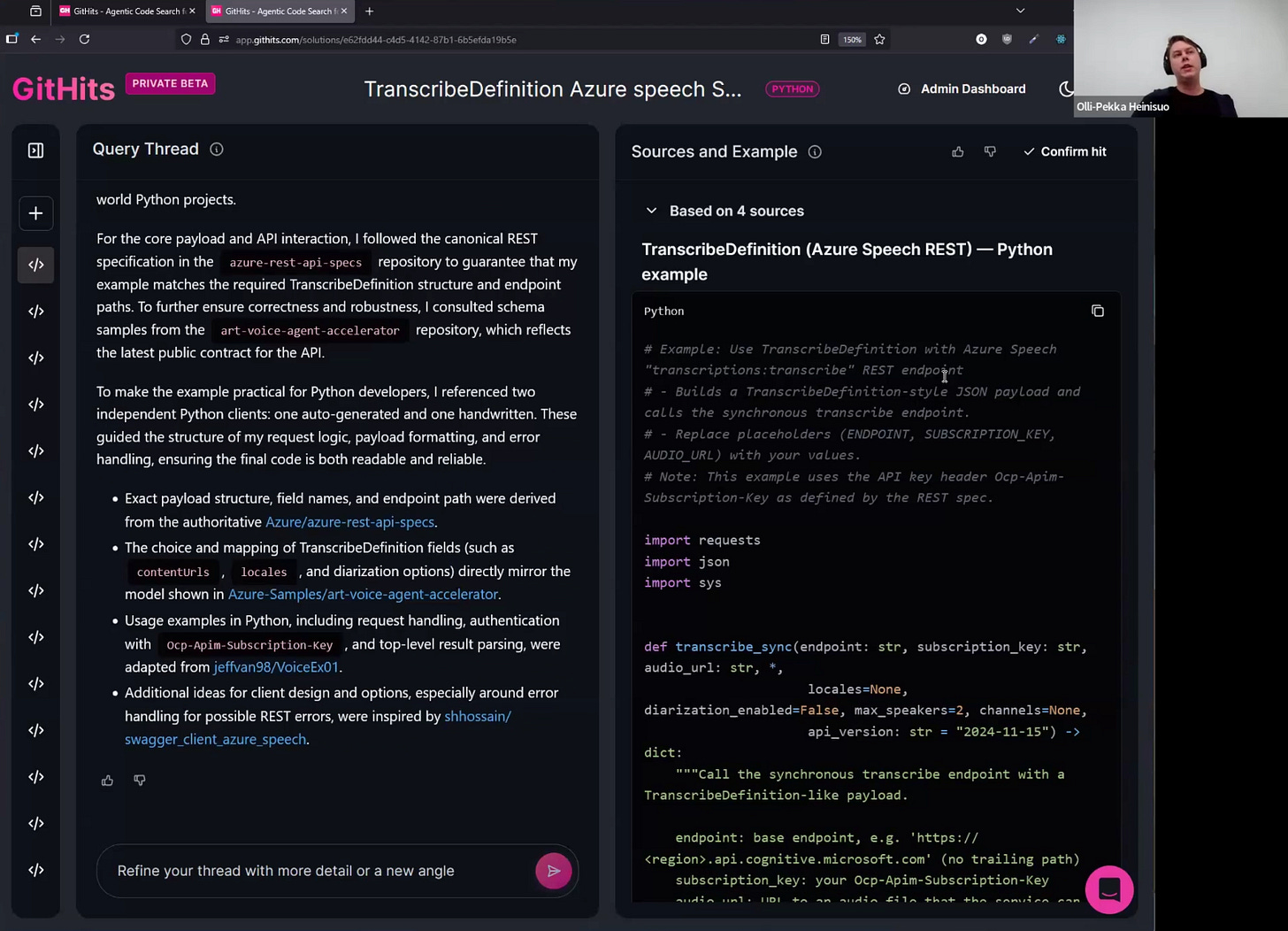 The idea for GitHits was born from a real-world example of this problem. A colleague was struggling to initialize a class from Microsoft's Azure Speech SDK. The necessary information was not in the published documentation, but it was available within Microsoft's public GitHub repository.