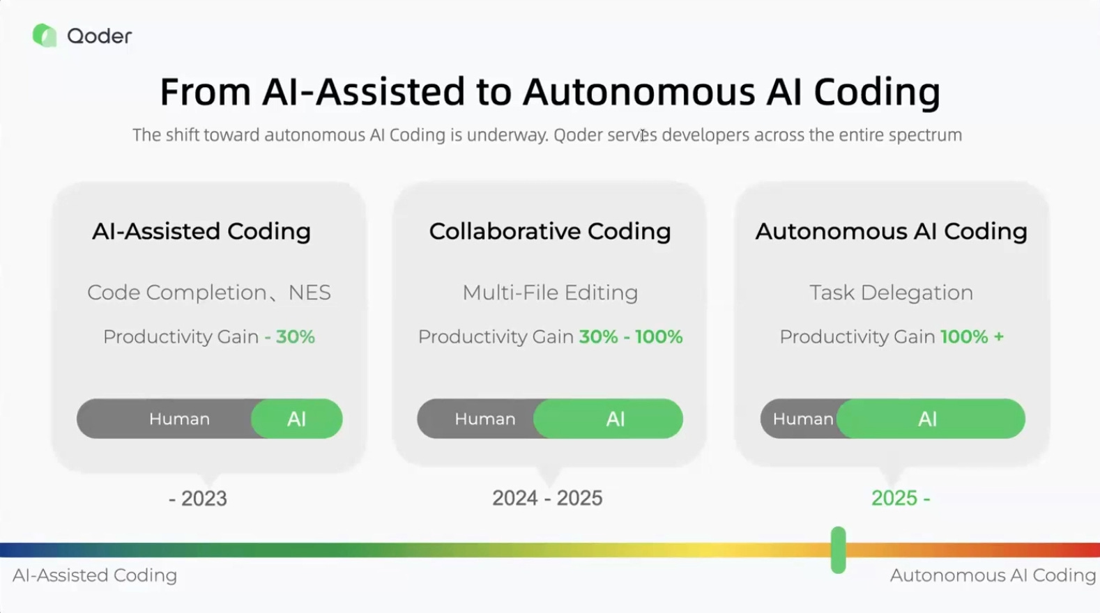 Stage Two: Collaborative Coding emerged in 2024-2025, enabling multi-file editing and complex refactoring. The interaction resembles pair programming with an intelligent colleague. Yu illustrated: “You might say, ‘I need to refactor this module to support multi-database,’ and then AI says, ‘Okay, I see three ways to do this, and let me show you how.’” Productivity gains range from 30% to 100%, with AI handling heavy lifting while humans provide guidance. Tools like Qoder and Cursor operate in this space.