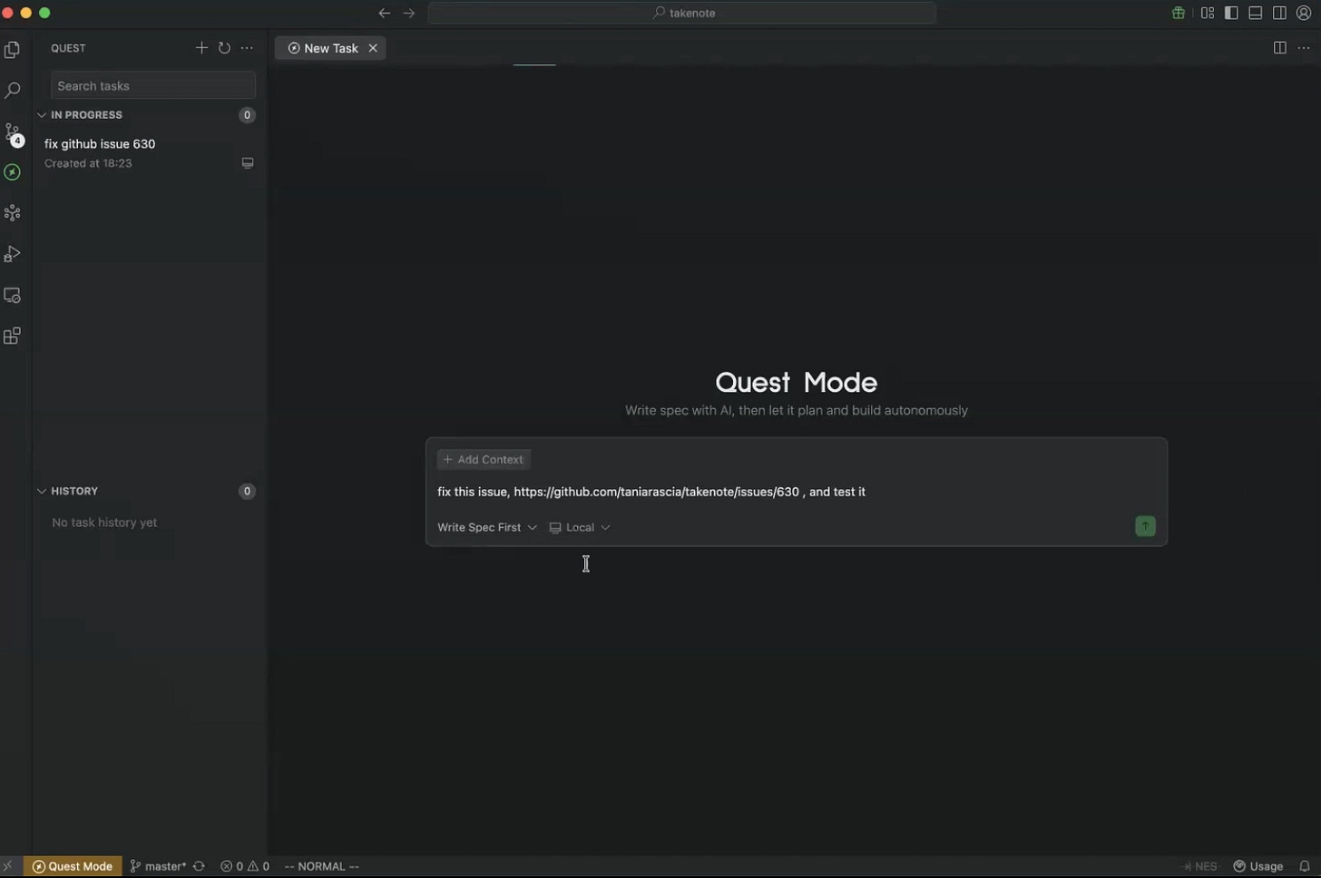 Returning to Quest mode, Yu found the autonomous agent had completed the TakeNote issue. The agent had updated dependencies, cleaned installed packages, tested both development and production builds, ran unit tests, and verified application functionality. Running npm install again confirmed the bug was resolved.
