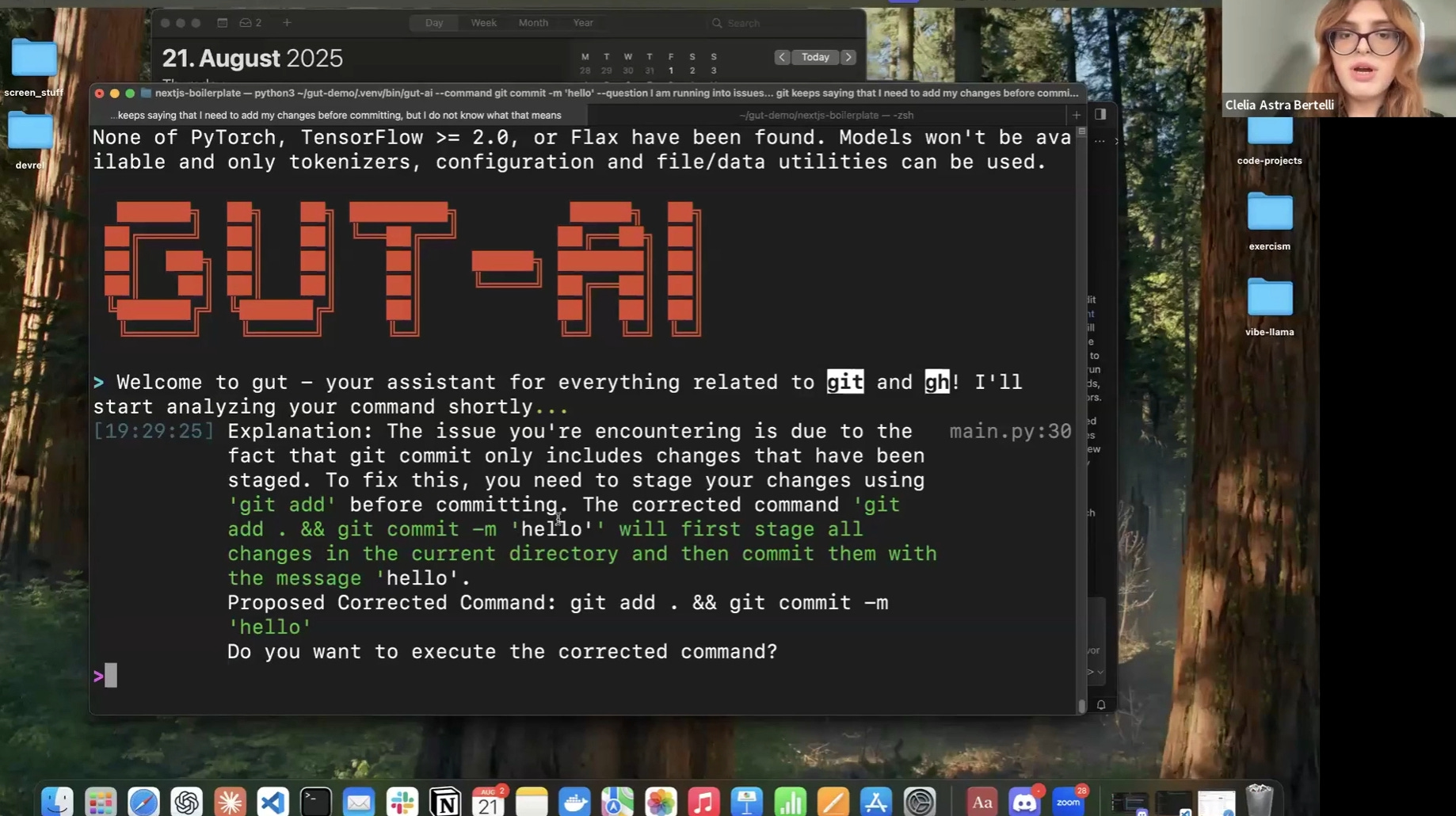 She concluded the demo by showcasing the tool's educational value. After intentionally writing a failing git command, she fed it to gut for analysis. The tool returned a patient, clear explanation of the concept of staging files, transforming a moment of frustration into a learning opportunity.