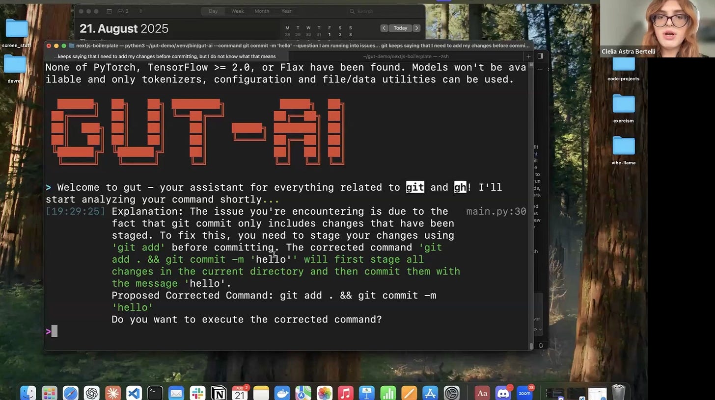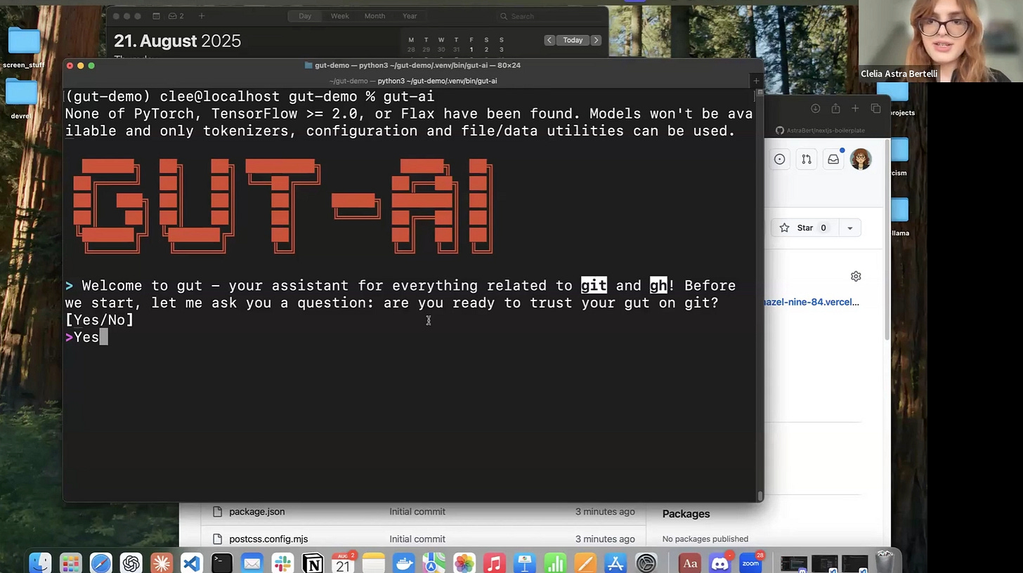The presentation then transitioned from theory to a live, compelling demonstration. Bertelli opened her terminal and, using gut as her partner, performed a complete development cycle on a Next.js boilerplate project. She made a simple code change and then, with a series of conversational requests, had gut check out a new branch, add the files to staging, commit them with a message, and push the branch to the remote repository.