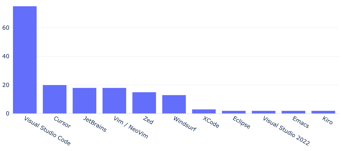 Notes: we were not surprised to see VSCode in the lead, but the gap to other IDEs, especially Cursor, is larger than we would have assumed based on public discourse in our feeds.