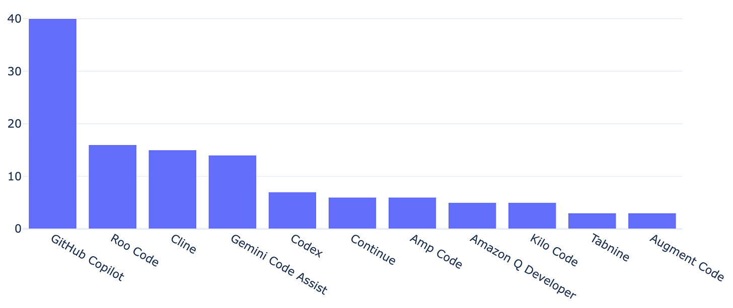 Notes: Roo Code surprises as #2, even above Cline. This category clearly has one strong lead and a long tail of options.