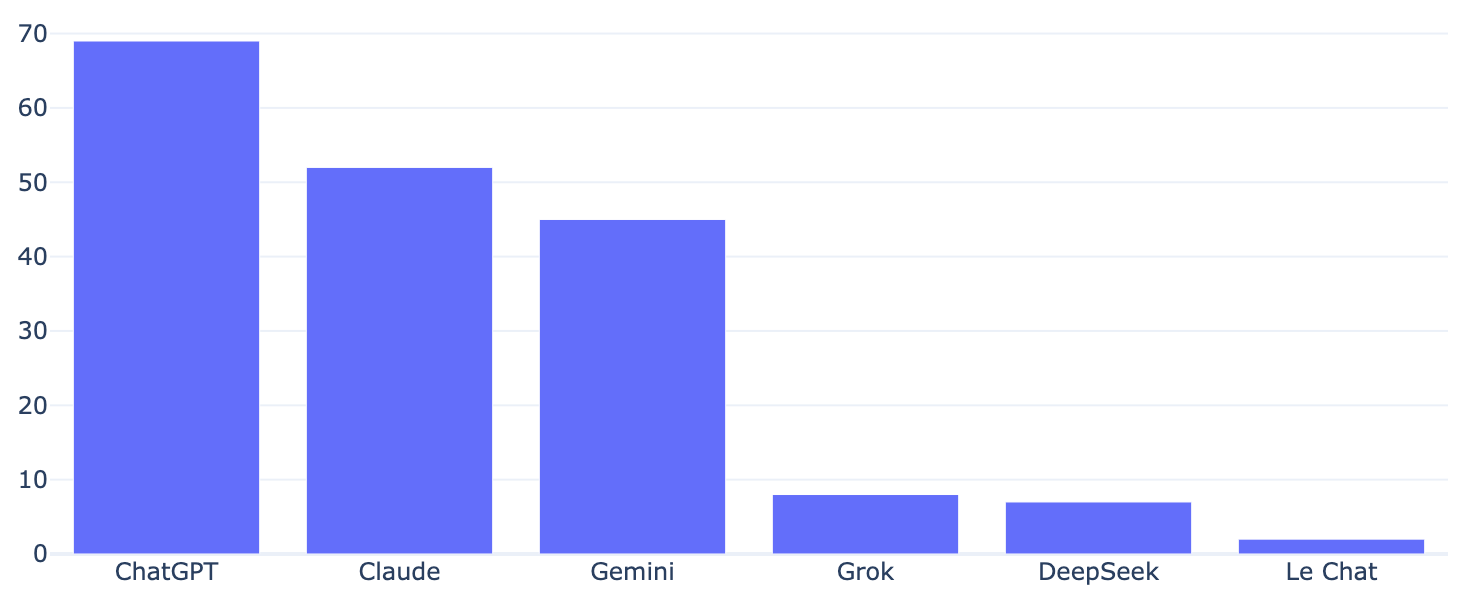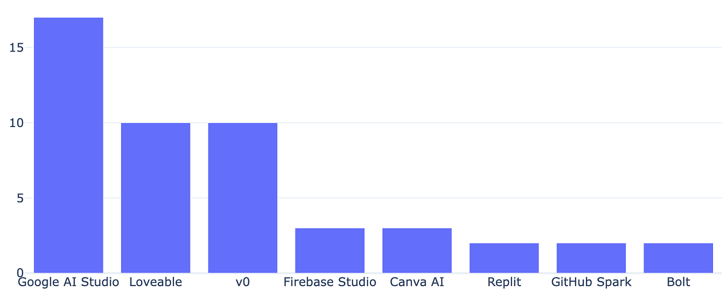 Notes: in hindsight, this question is ambiguous, since it’s not clear if respondents use Google’s AI Studio’s vibe-coding capabilities, or just use it in general. Still, not surprising that developers love AI Studio, Google has managed to create a great tool that lowers the barriers to adoption, and they top it with generous free tier usage.