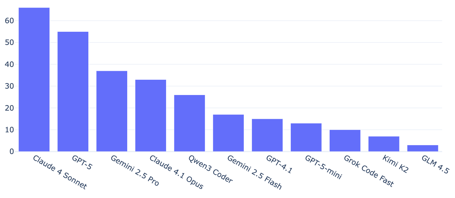 Trailing: Claude 4.1 Opus, Qwen3 Coder, Gemini 2.5 Flash, GPT-4.1, GPT-5-mini, Grok Code Fast