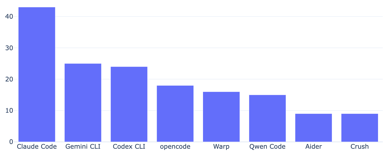 Notes: Claude Code still has the significant lead appropriate for a category-defining product, but developers are also experimenting with many other terminal agents that are now available from multiple vendors and in many flavours.