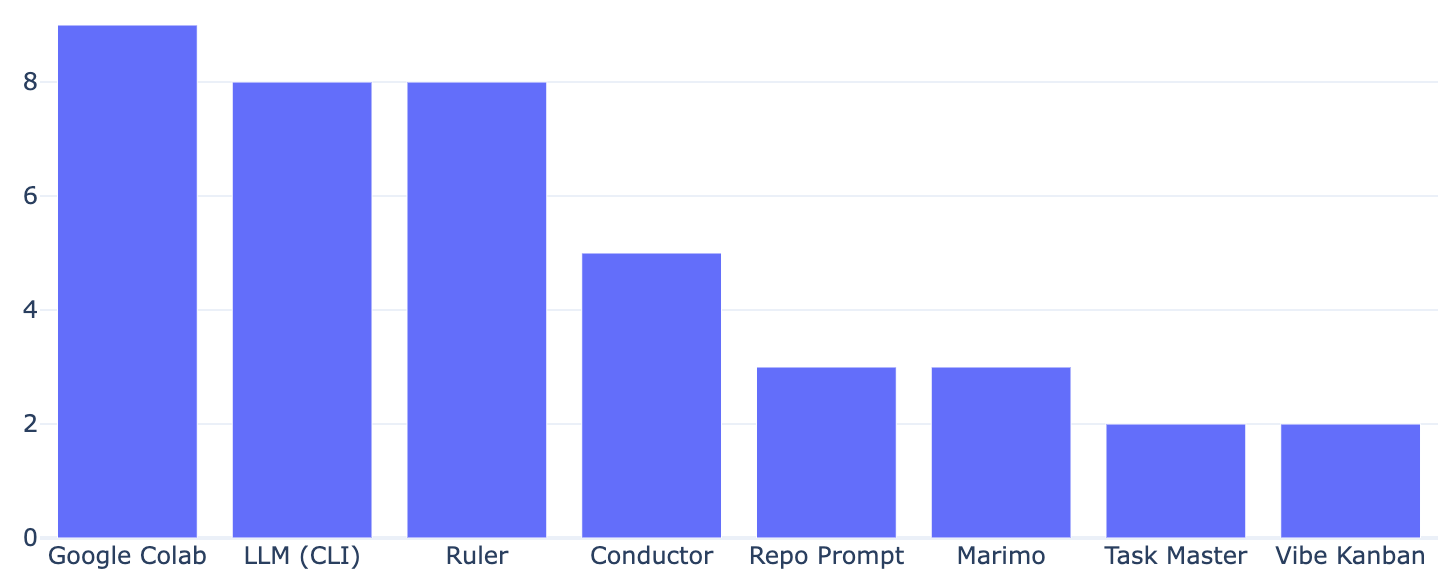 Notes: this category is a mix of very different tools, and there’s not much to learn from relative values. Once again, it’s also not clear if respondents who chose Google Colab did so for its built-in AI coding capabilities, or just as a tool they use in general for working with notebooks. Eleanor is, of course, delighted to see so many of you using Ruler to manage your context and config across different agents.
