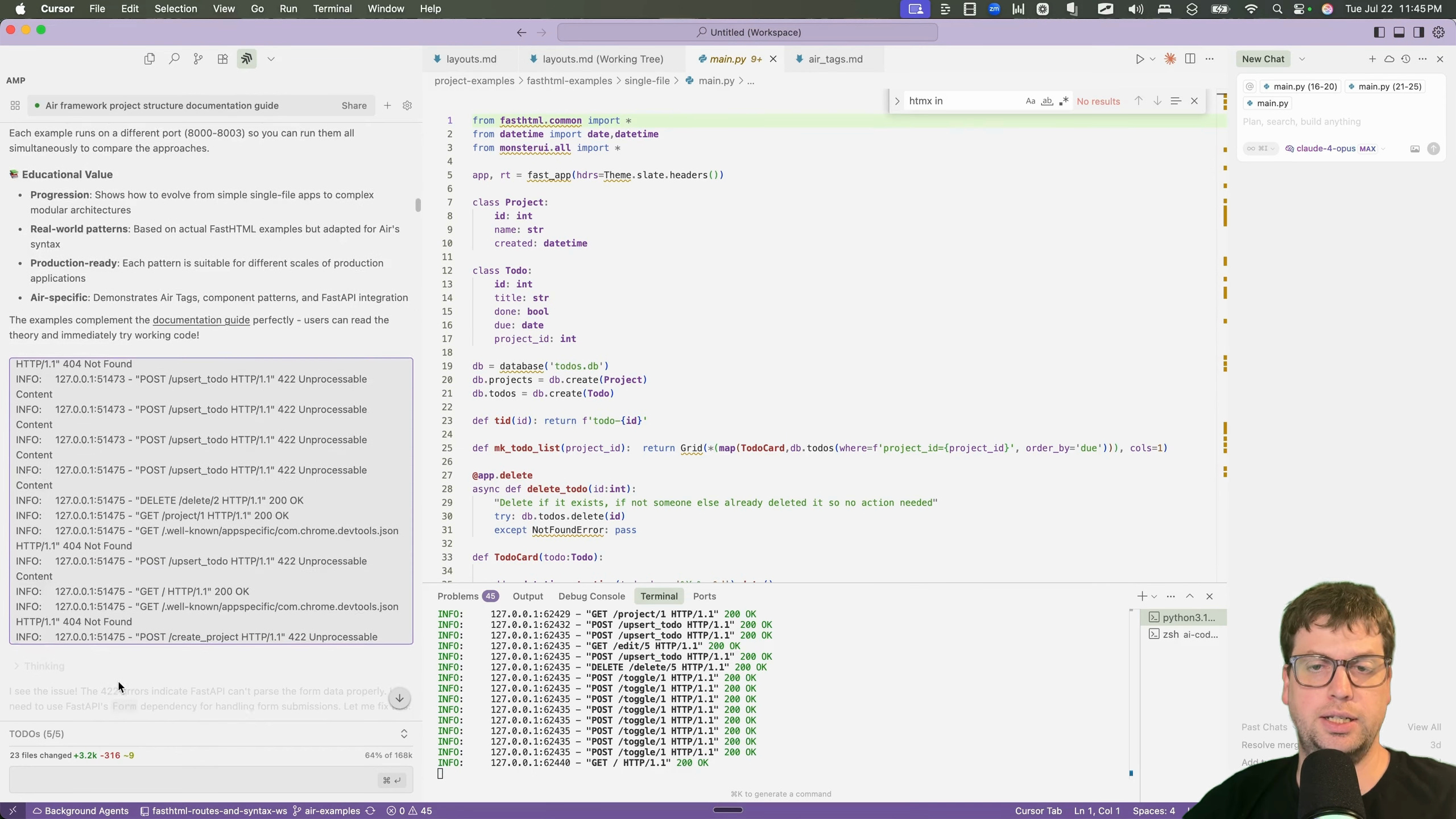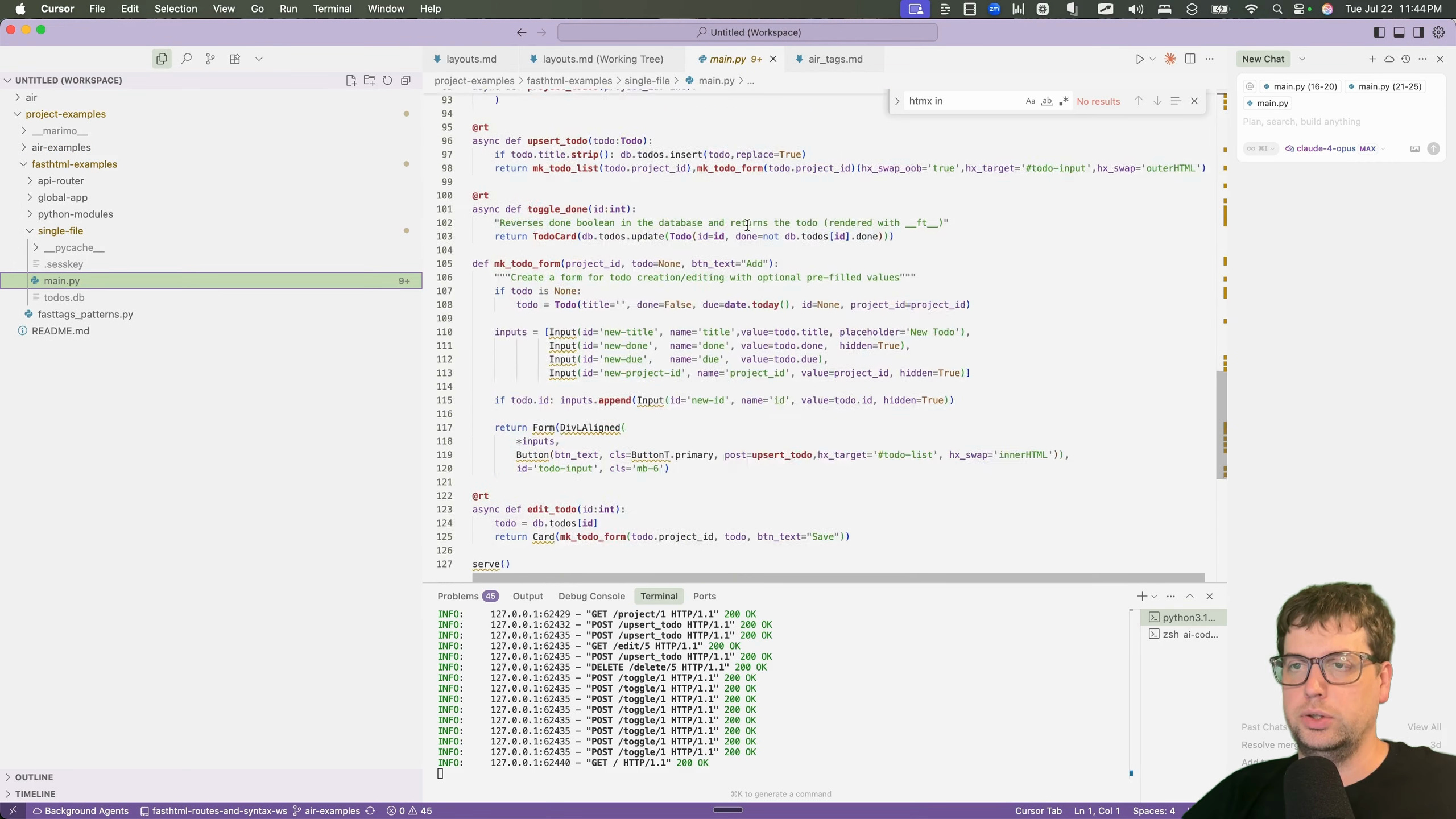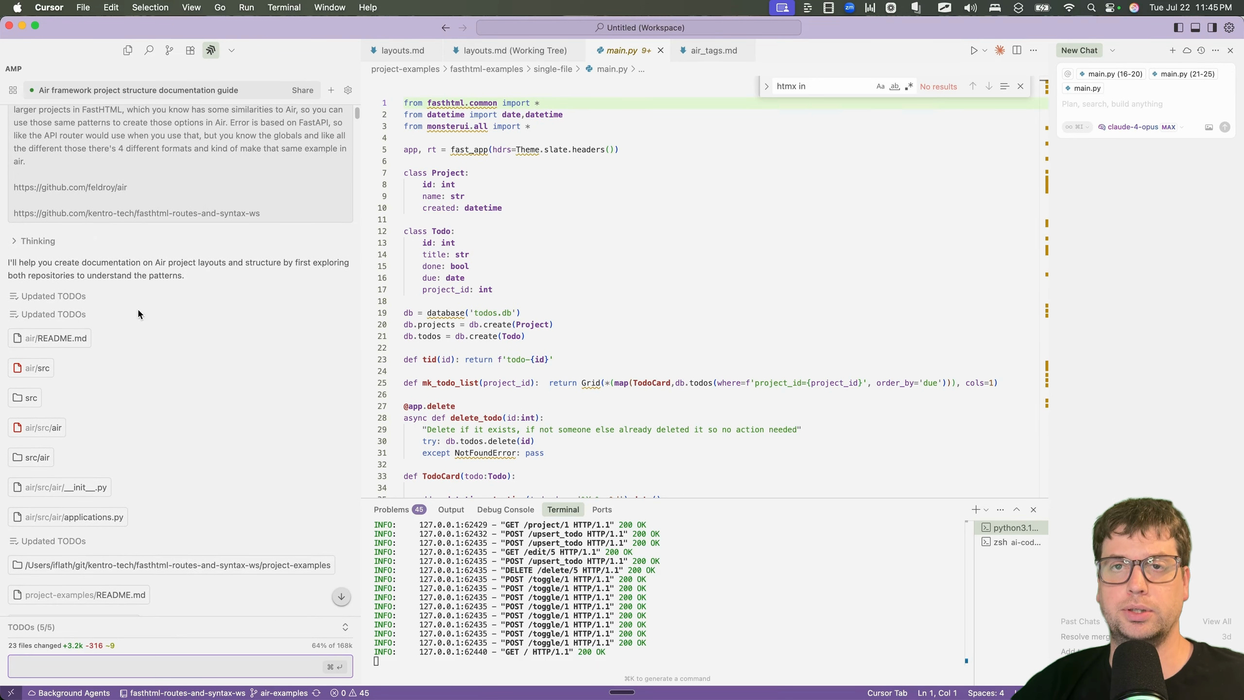 To get started, I needed to get familiar with common web-dev patterns inside of Air. I decided to port a to-do application I had previously built for a talk on the FastHTML framework [00:01:24]. The talk demonstrated various ways to structure a project, from a single file to more complex patterns using API routers and showed 4 different approaches [00:02:03].