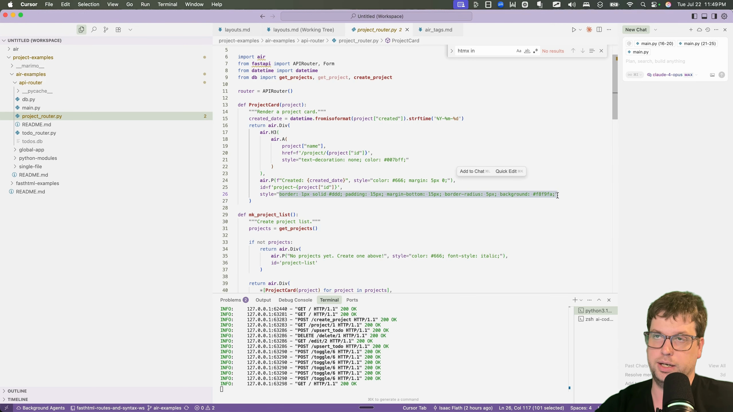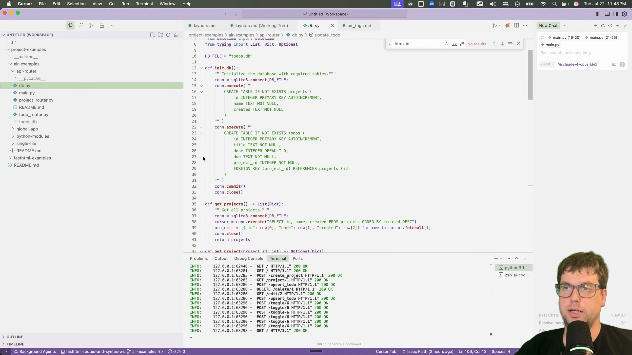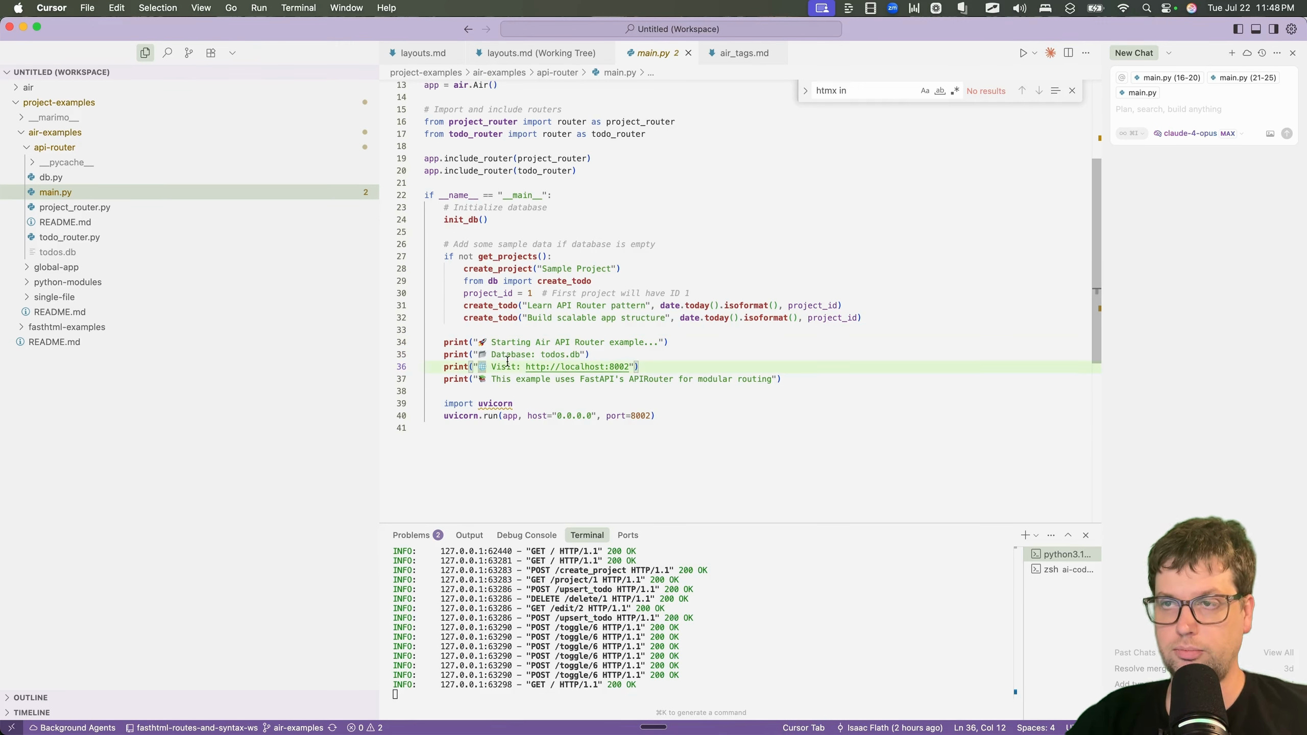 To get started, I needed to get familiar with common web-dev patterns inside of Air. I decided to port a to-do application I had previously built for a talk on the FastHTML framework [00:01:24]. The talk demonstrated various ways to structure a project, from a single file to more complex patterns using API routers and showed 4 different approaches [00:02:03].