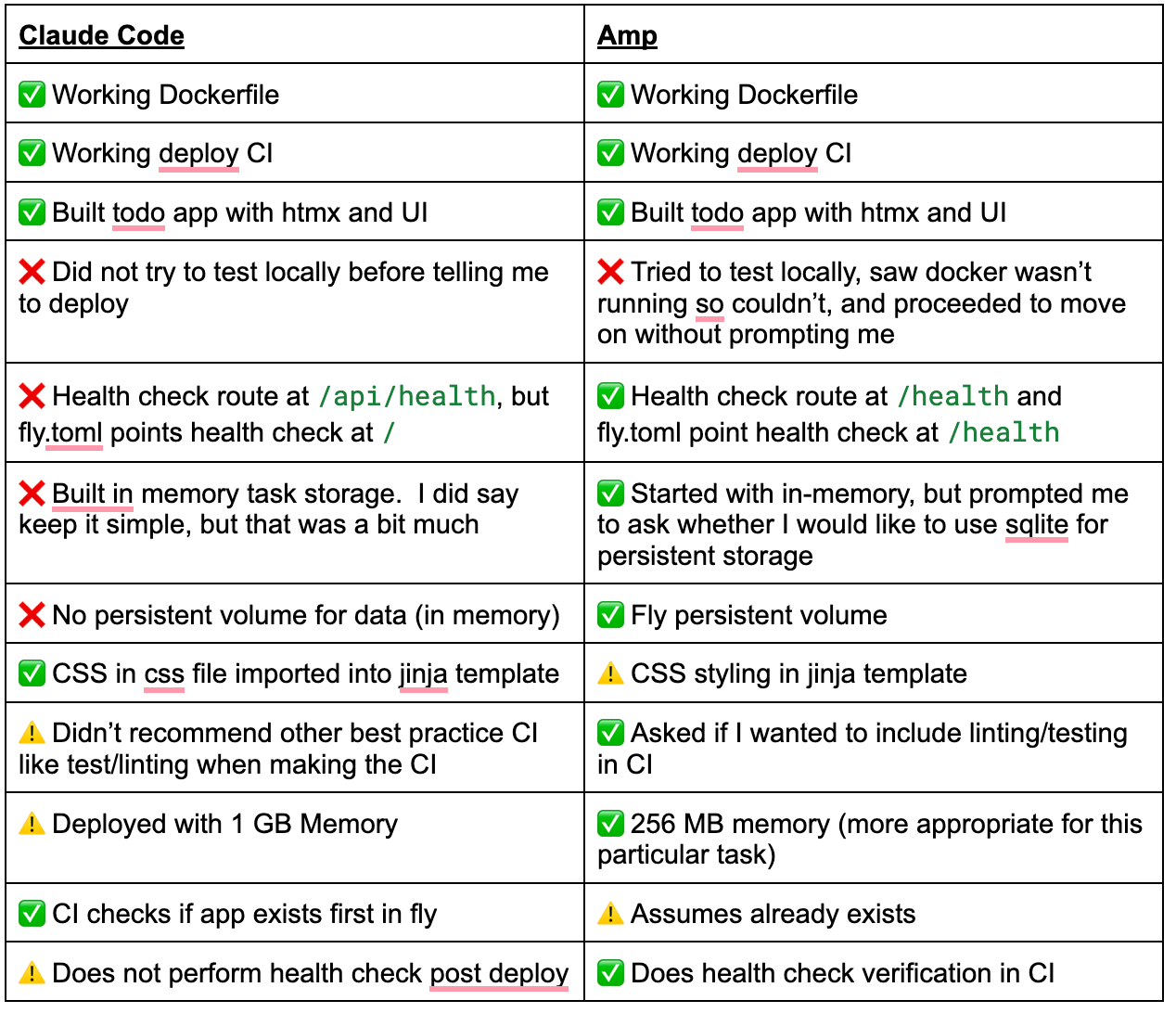 Differentiator 1 - the health check: There’s not much to say here. Both Claude Code and Amp used a health check for deployment, but Amp’s worked and Claude’s had a critical bug.
