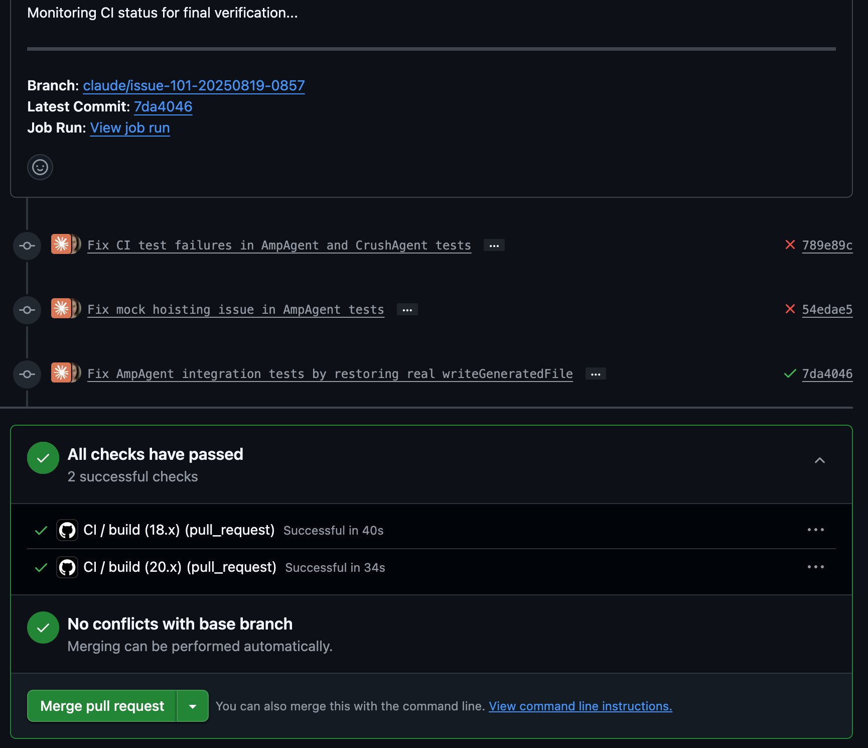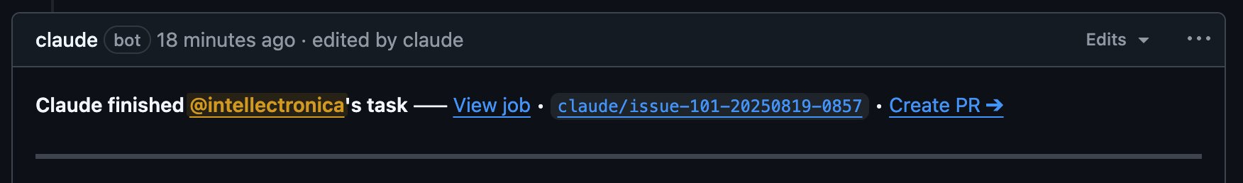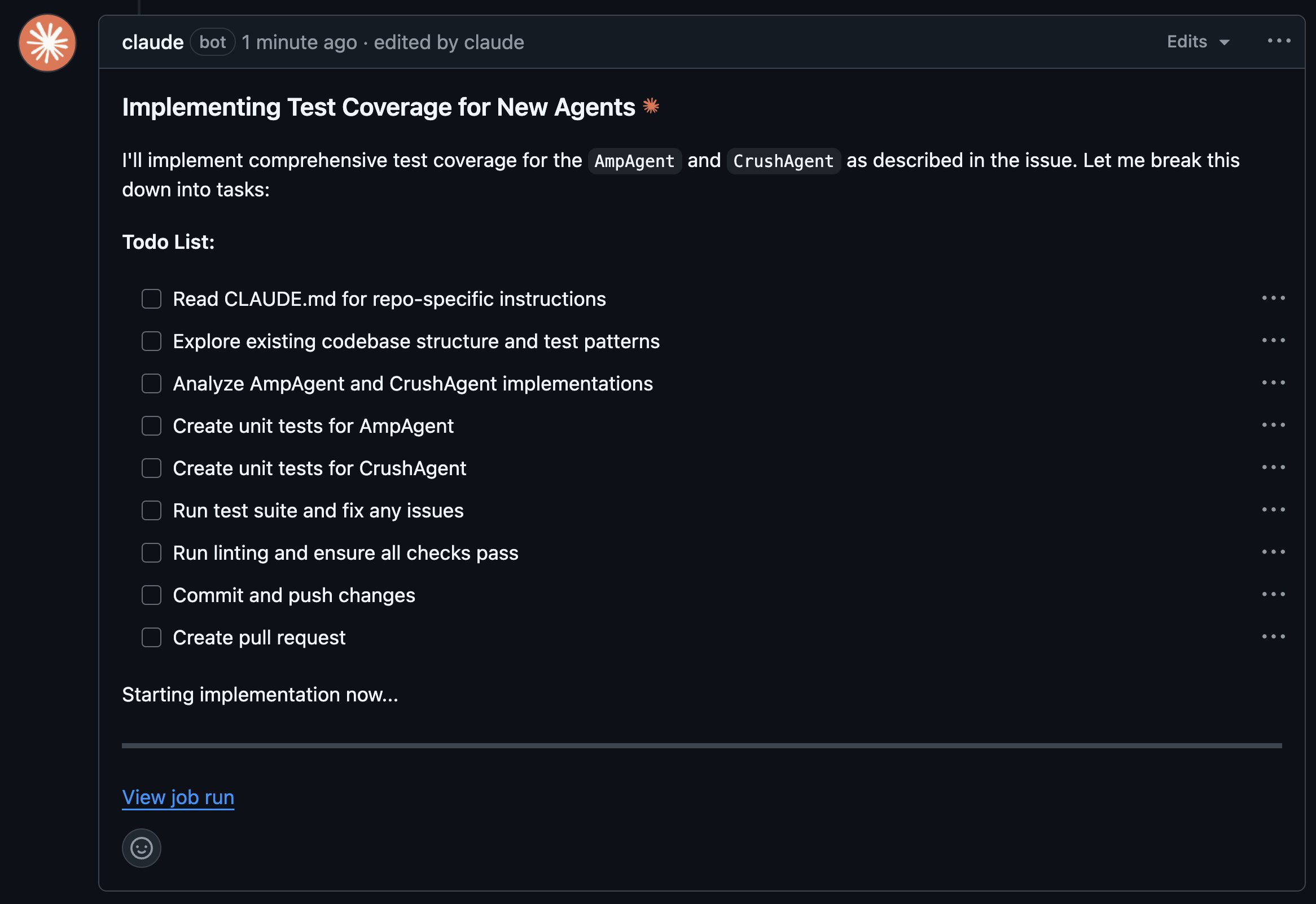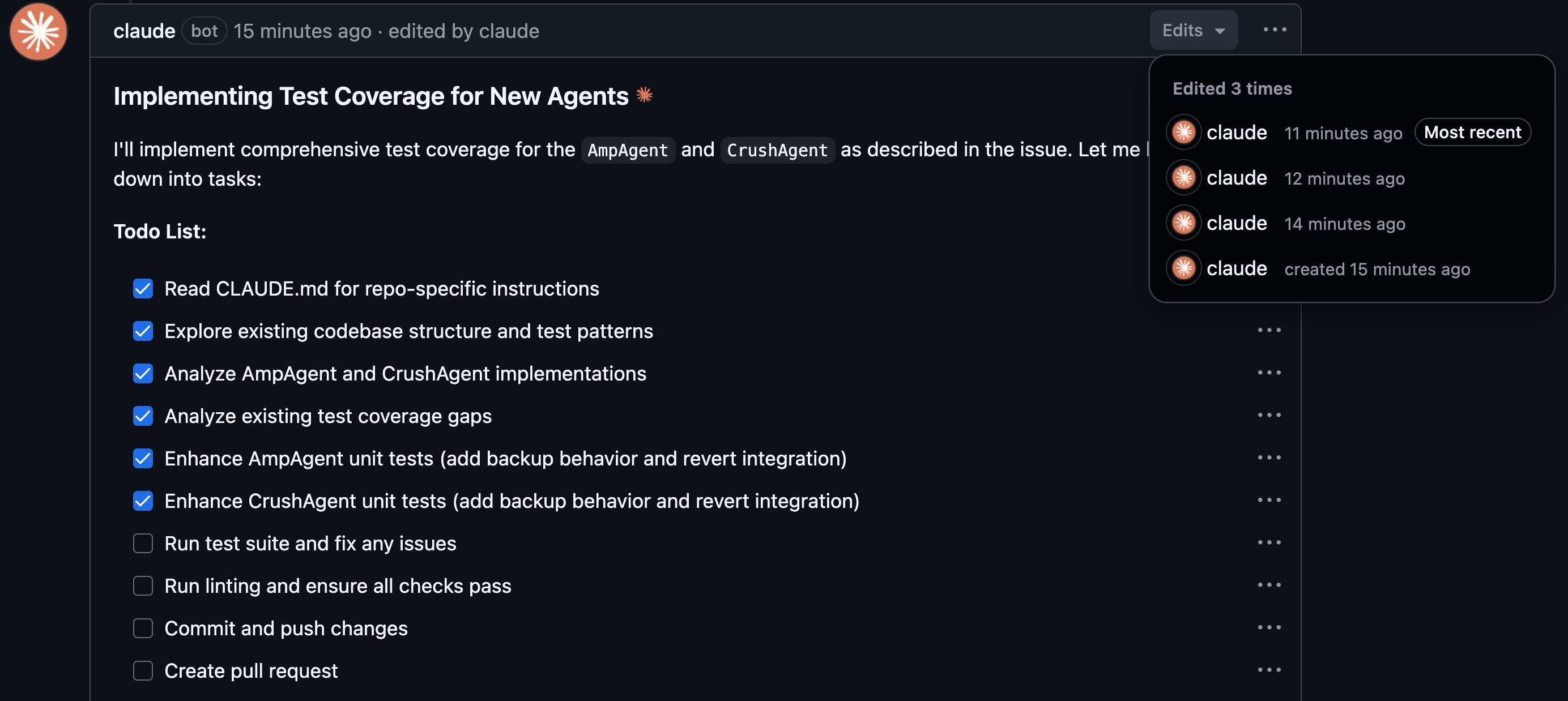 The user experience was highly polished. Claude promptly replied with a comment confirming it was working, including a link to the live job run. It then posted another comment with a detailed, itemized to-do list, which it updated in real-time as it progressed. This provided excellent visibility into its process. The commits and comments were made by a dedicated "claude" user, making its contributions easy to identify.