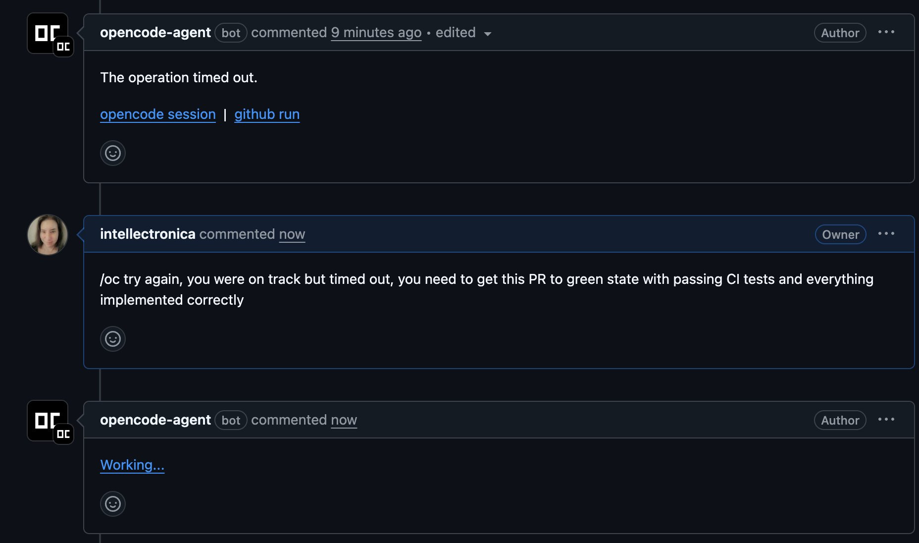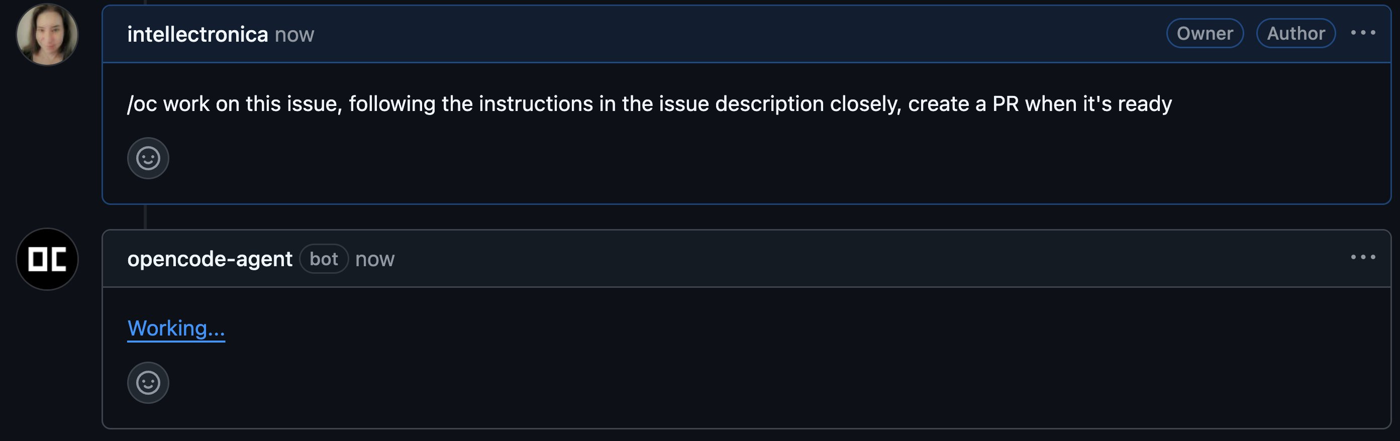 comment on an issue. The user experience was excellent. The agent, posting as a distinct opencode-agent