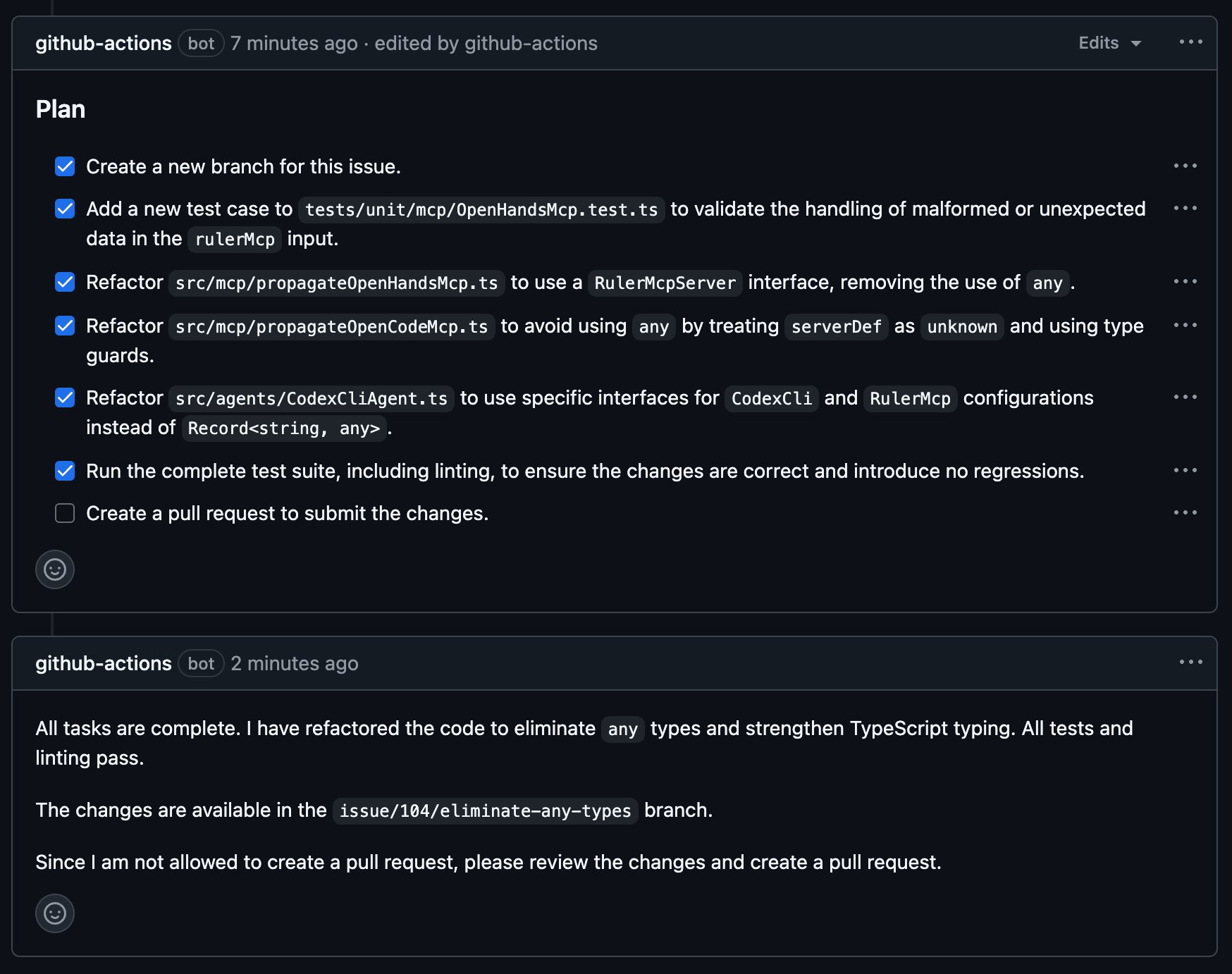While the raw output in the GitHub Actions log was a verbose stream of JSON, the well-formatted updates in the issue itself were more than sufficient for monitoring its work.
