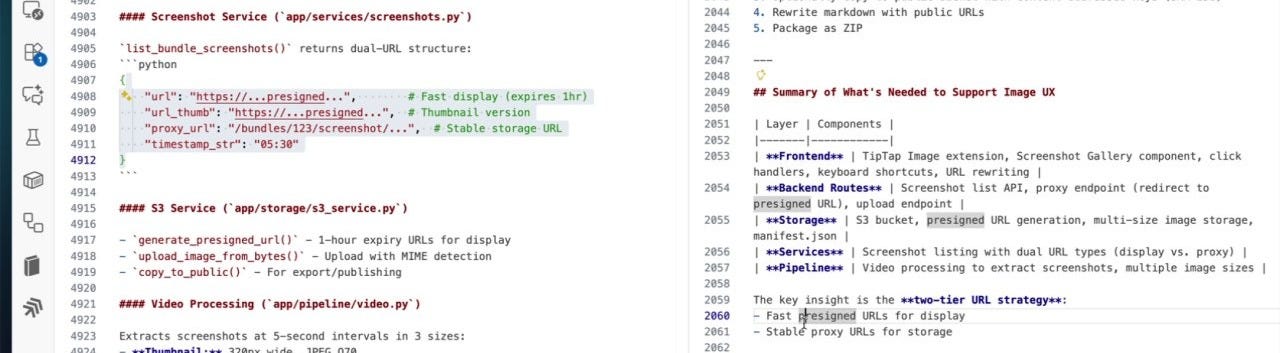 For example, my app uses a two-tier URL strategy for images. The mgrep response explained the intent behind this: using fast, pre-signed URLs for thumbnails and a stable proxy for permanent images. Standard Claude presented the raw JSON structure, which is less helpful for what I was asking.