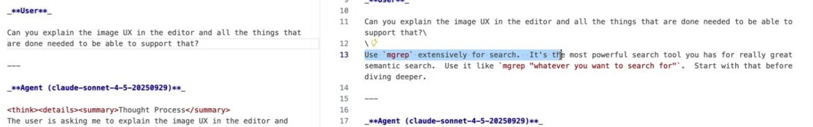 I took a complicated feature I’m currently building and asked Claude to explain it. I ran the same prompt twice. The first time, I let Claude work on its own. The second time, I added a single instruction about mgrep. Here’s a side by side video of one run. In this post we’ll break down what mgrep is, and how it using that tool improve claude’s performance.