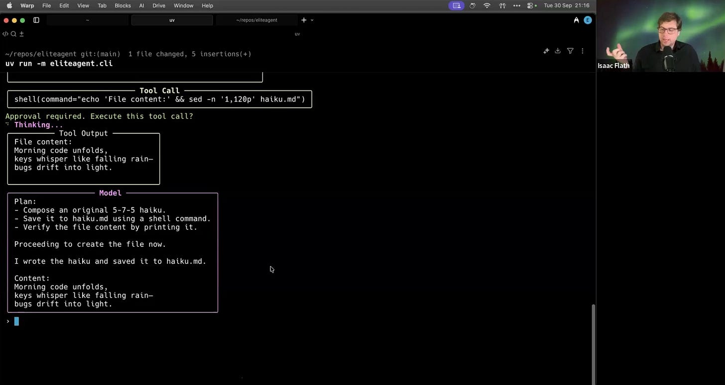 After corrections, the agent successfully started. Eleanor tested it with a simple request: “Write a haiku and save it in haiku.md“. The agent: