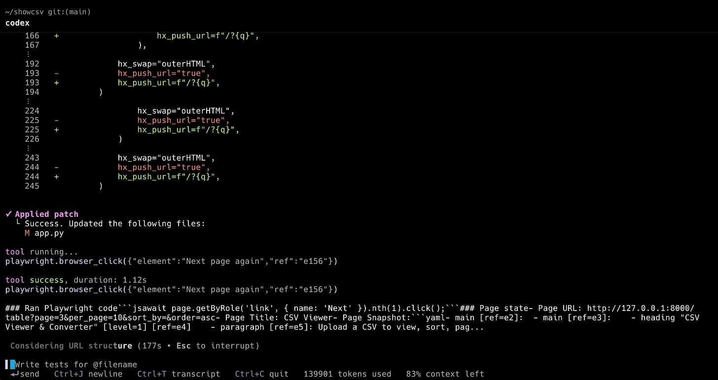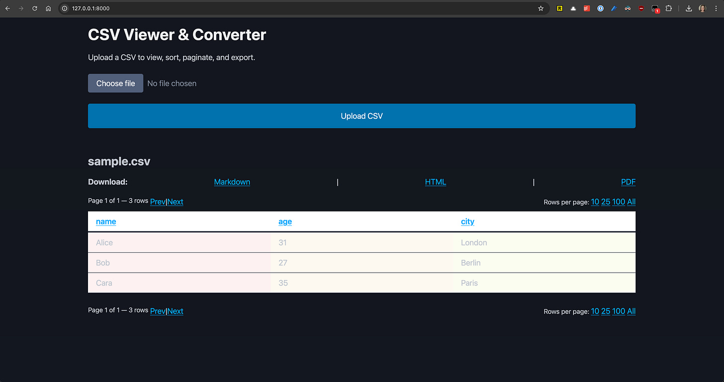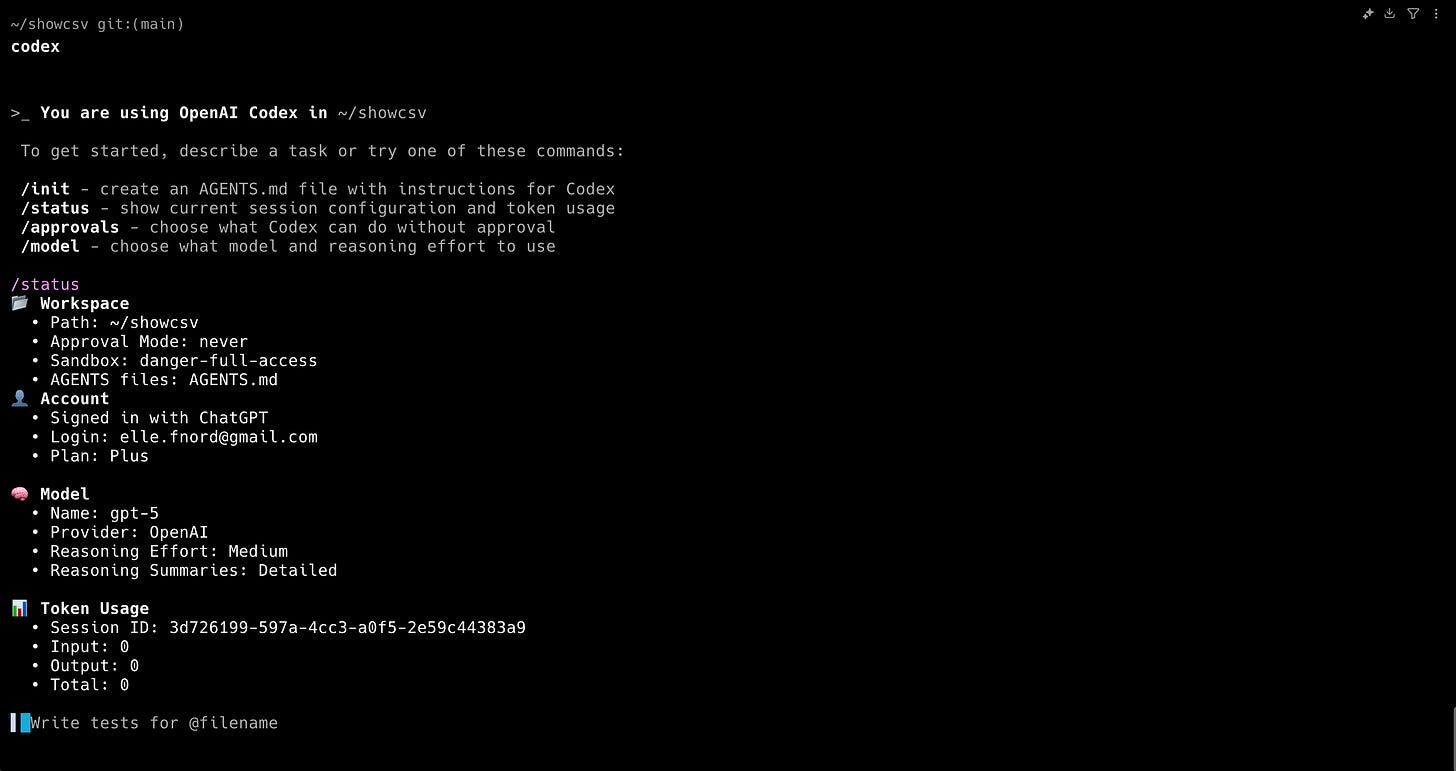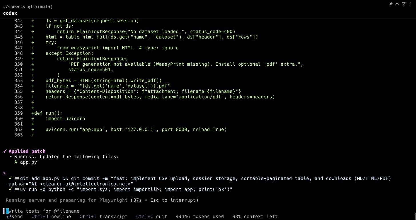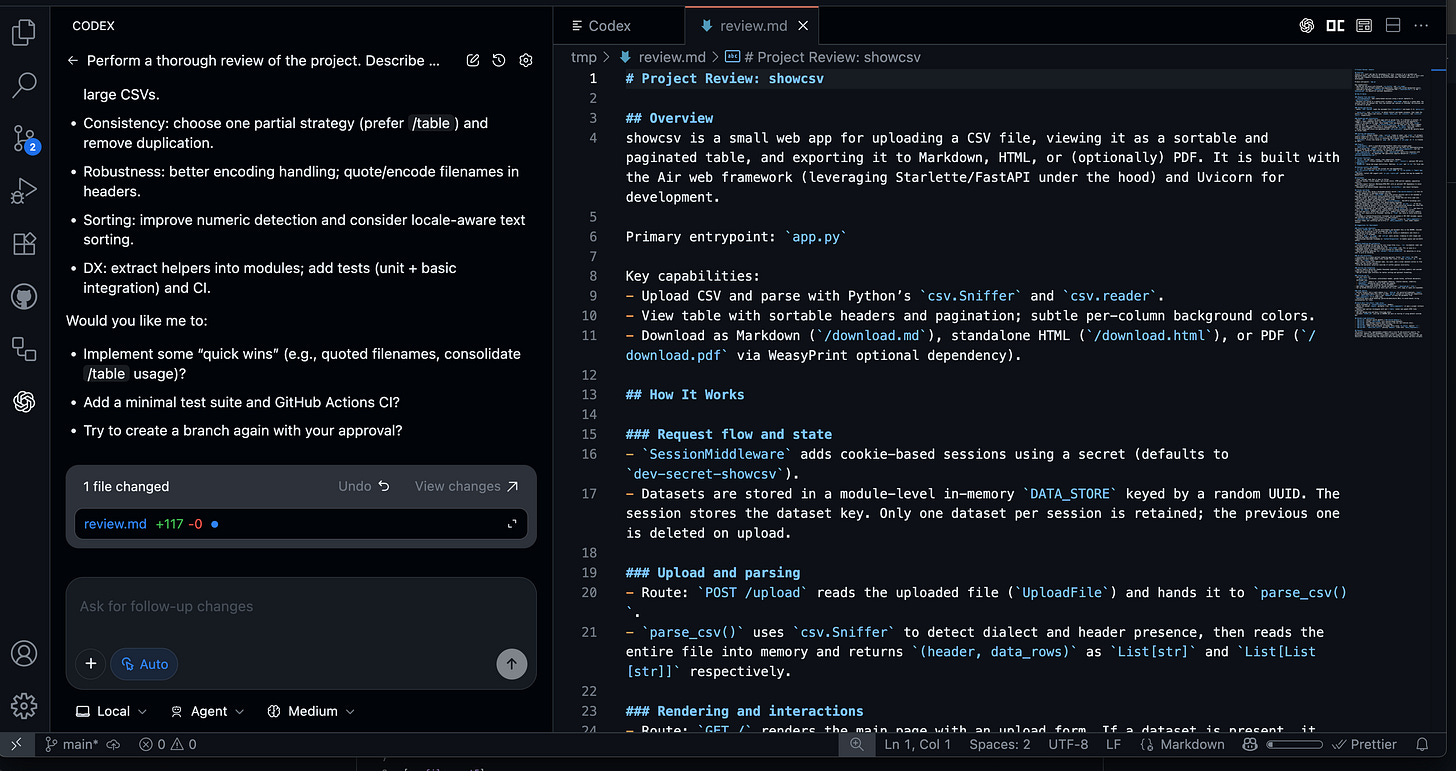 To test Codex CLI properly, I built a CSV viewer and converter web application using the AIR web framework. This provided a comprehensive test of both the tool and GPT-5's capabilities in a realistic development scenario.