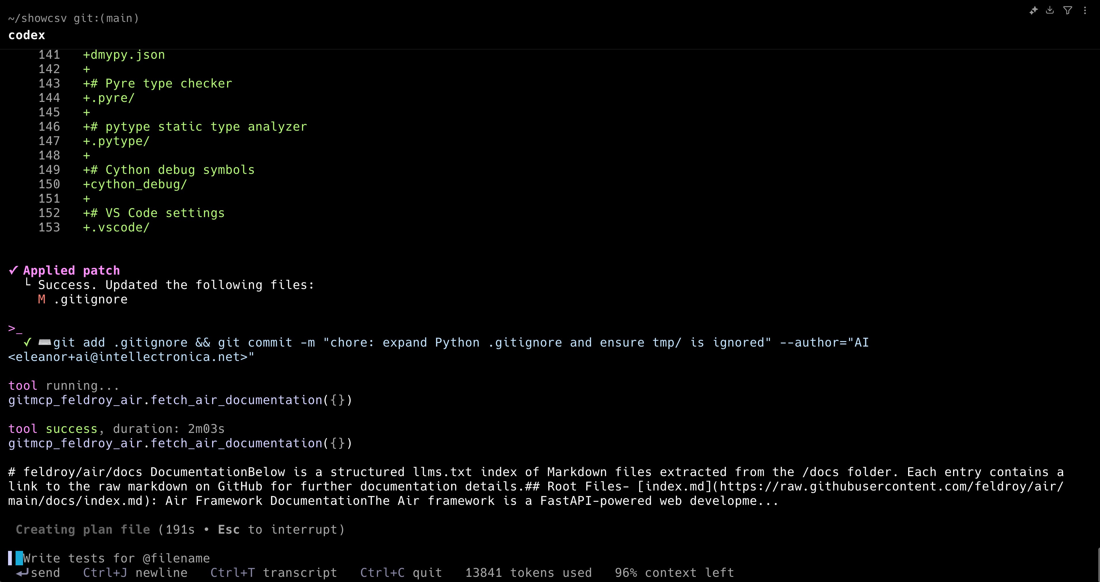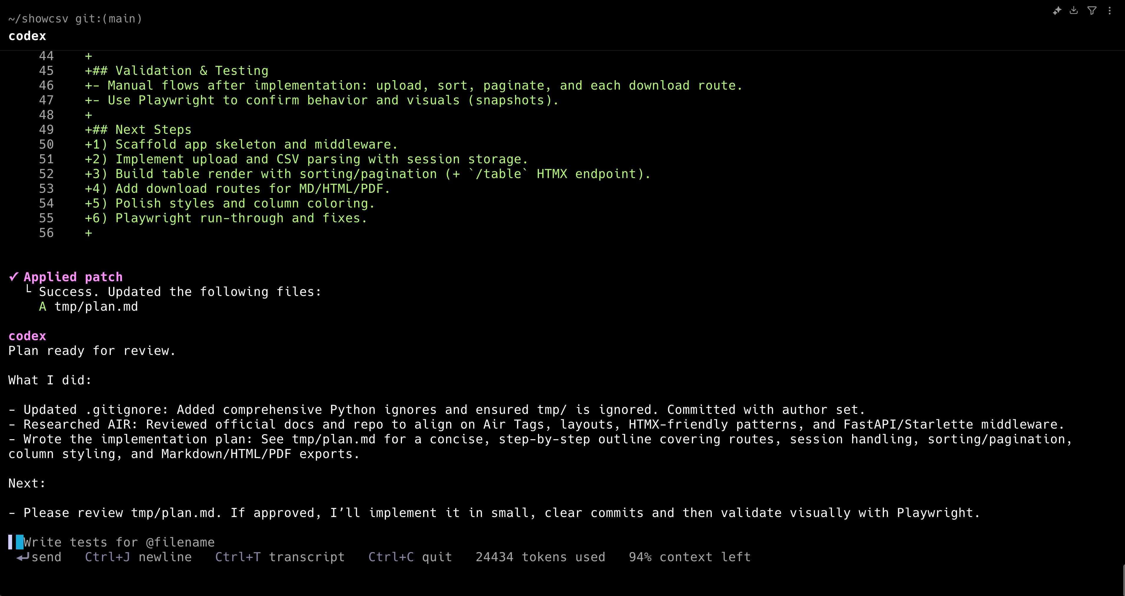 After reading the task definition, Codex CLI began exploring the AIR framework documentation through the GitMCP server. It systematically reviewed core framework concepts like the FastAPI foundation, UI creation using AirTags, HTMX integration patterns, and the routing and templating systems. This research phase resembled watching an experienced developer learning a new framework — methodical and thorough.