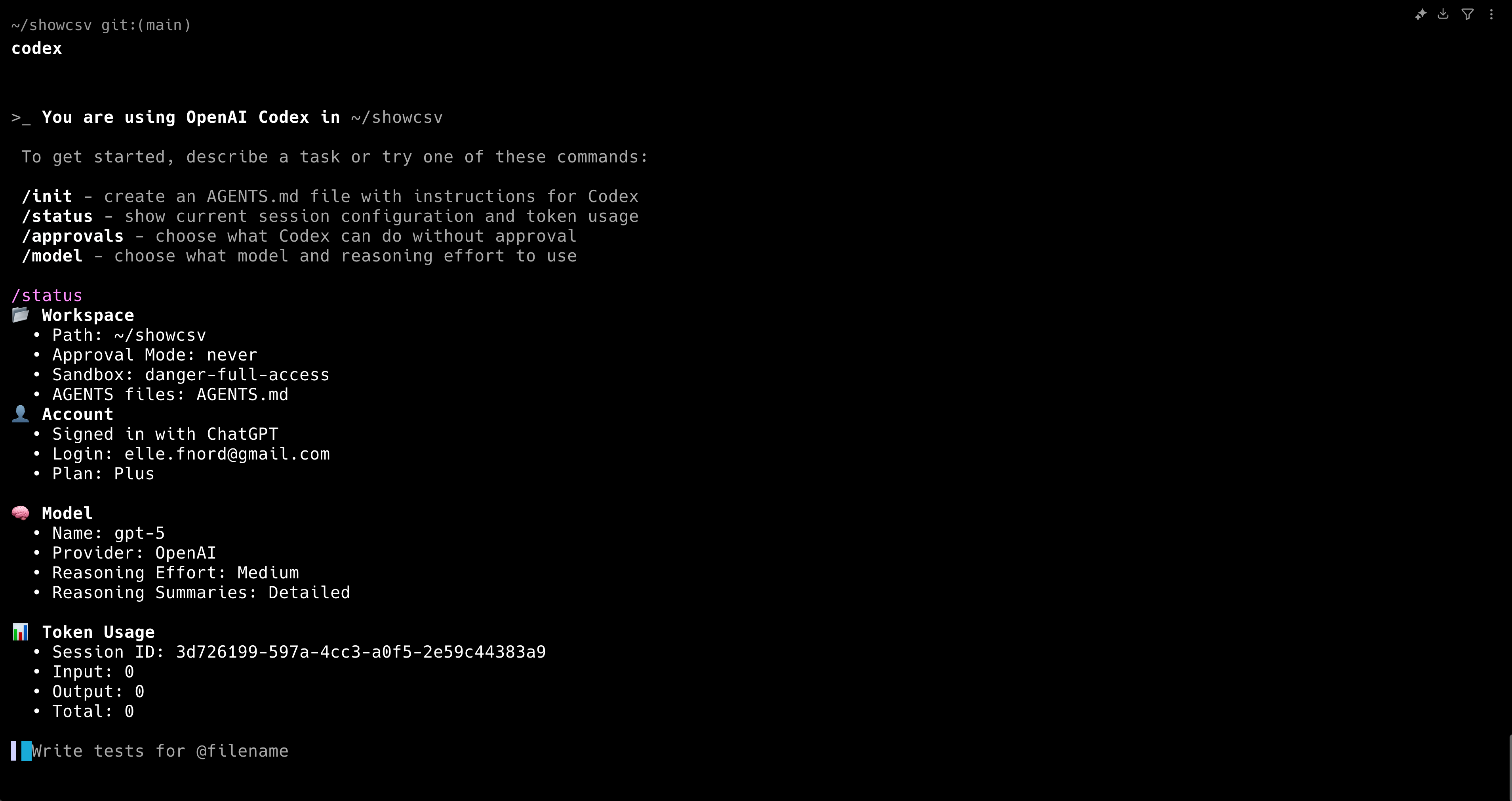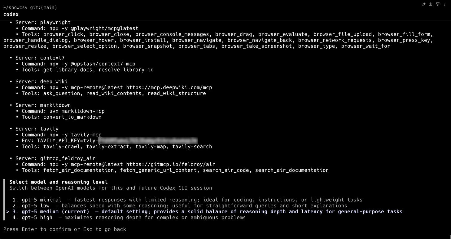 With everything configured, I launched Codex CLI and confirmed all MCP servers were functioning correctly, as well as GPT-5 model access with medium reasoning effort.