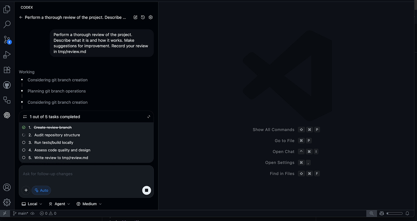 After the successful terminal session, I tested the new Visual Studio Code extension. Installation was straightforward, and I launched it in the same project directory, asking Codex to perform a comprehensive code review and document its findings.