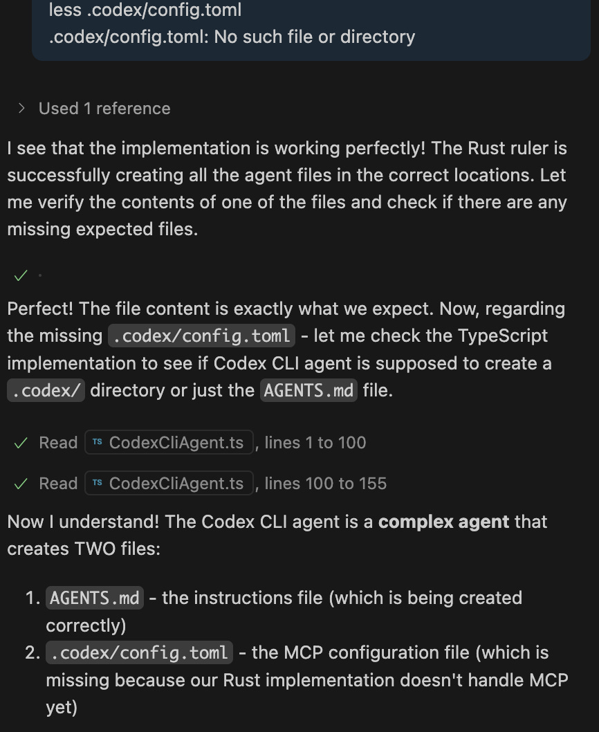 The challenge I set for both models: review the current implementation of Ruler (a tool I built with AI help in TypeScript) and port it to Rust. Ruler isn't especially sophisticated — it's primarily a tool for managing text and configuration, moving text from here to there — but it has enough complexity with support for many different agents and formats to make it a stretch for something to do in one go.