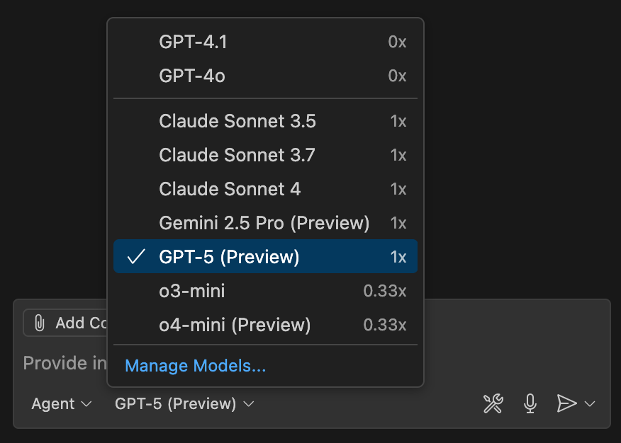One thing I appreciate about the the GitHub Copilot subscription, is that it meters work by requests, rather than tokens. Rather than anxiously counting every interaction and hoping it won't cost me too much, I could predict the cost based on the number of requests I made to the chat. In this case, both GPT-5 and Claude 4 Sonnet have the same 1X multiplier for "premium requests".