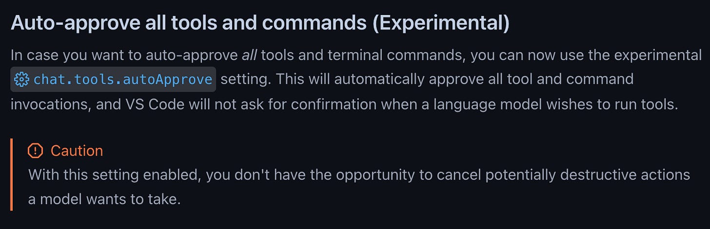 Addendum: only after completing this task and publishing the writeup, I found out that GitHub Copilot Chat in Visual Studio Code already has an experimental flag for auto-approving commands. This is obviously something you’d want to run in an isolated environment, but it’s going to save me a lot of time in the future.