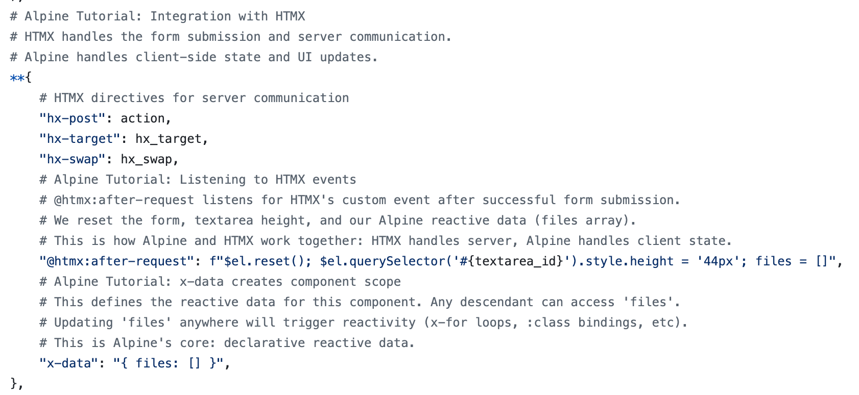 Take this Python code. It uses HTMX and Alpine.js. Add comments to make it a detailed tutorial explaining the Alpine.js concepts and patterns being used. Explain why each directive (