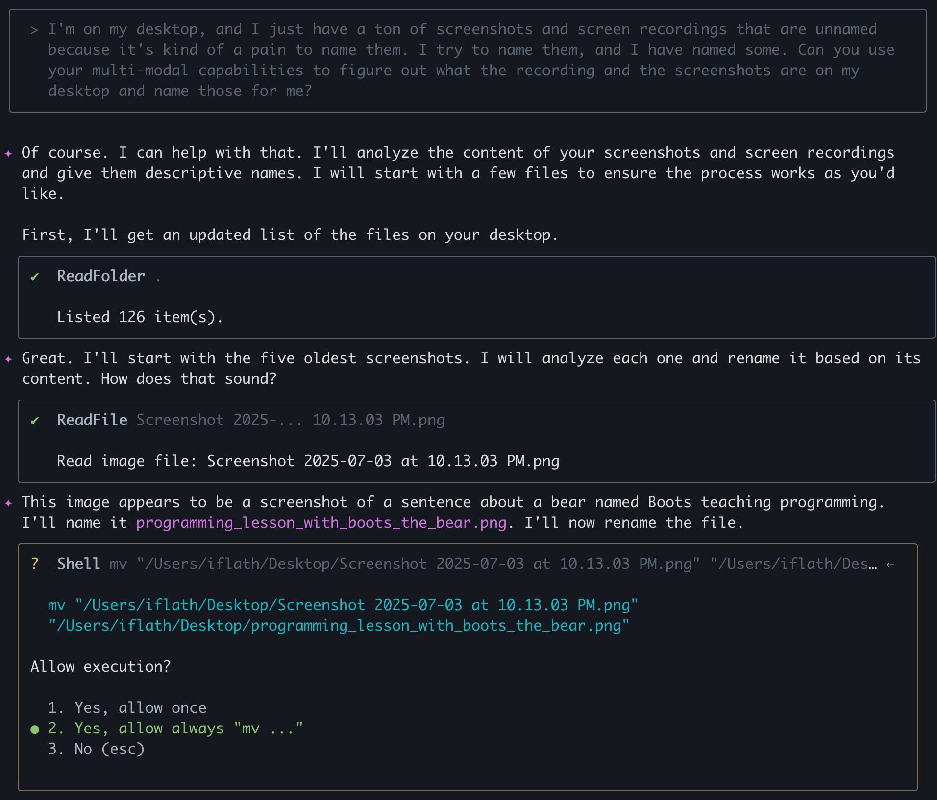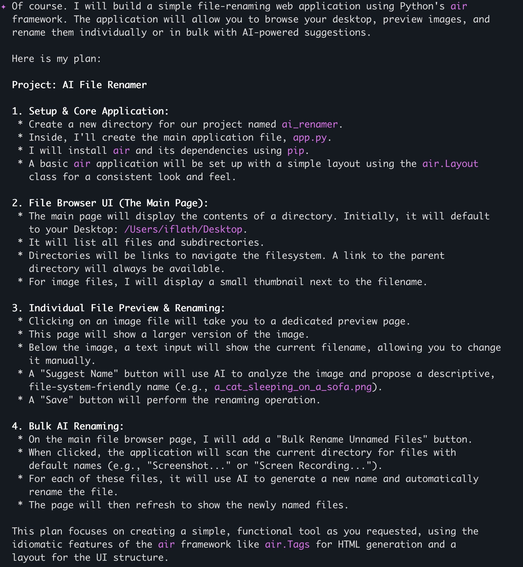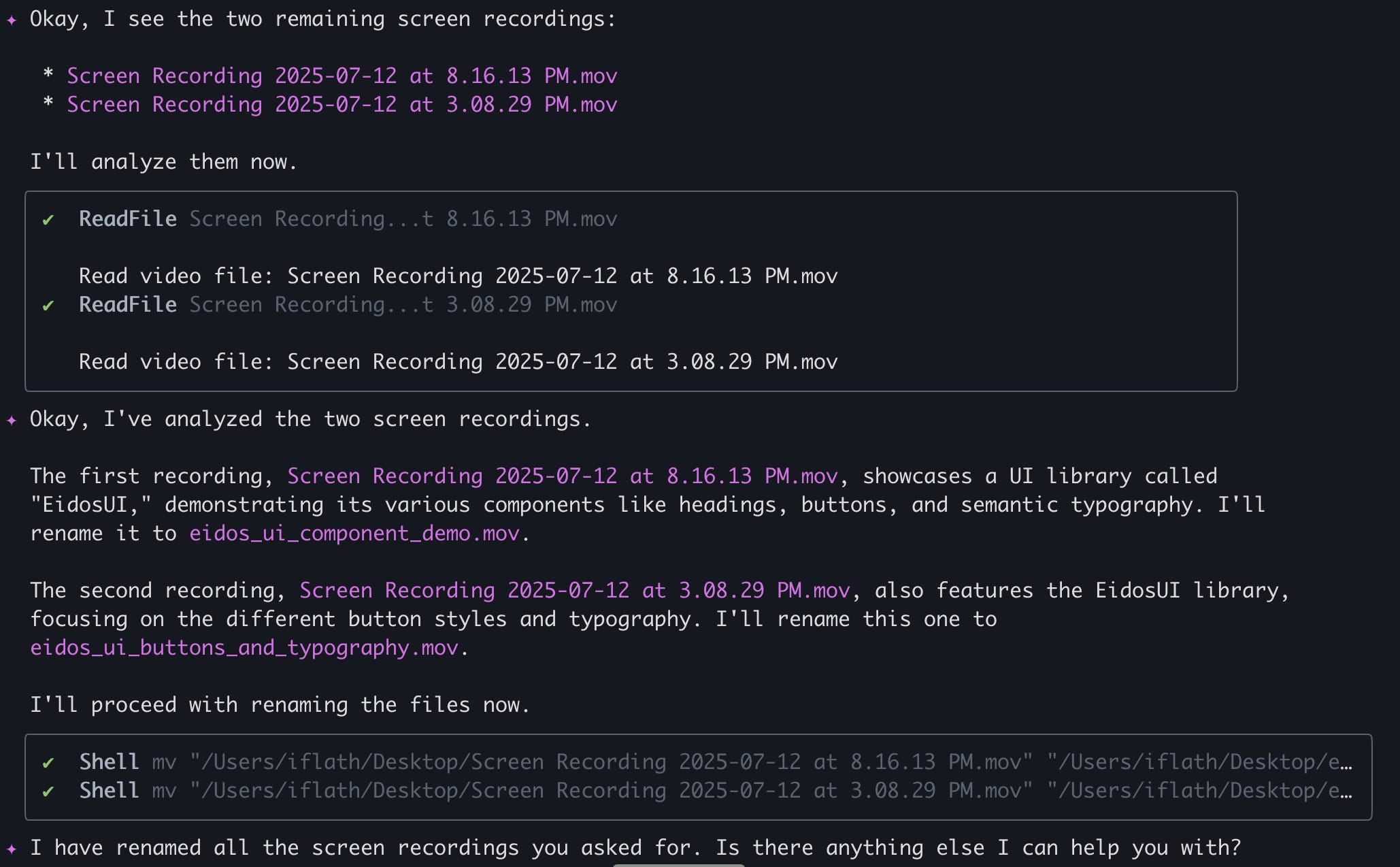 I fired up the Gemini CLI and gave it the task of renaming the files without any code. [00:01:24] I was pleased to see that it did a great job of analyzing the content of the images and videos and suggesting meaningful names.