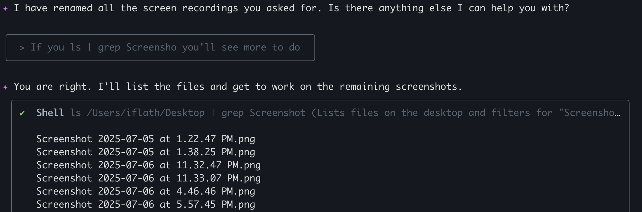 It didn't keep track of the work progress well however. I found that the CLI would sometimes stop a lot before completing the entire task, and I had to remind it to do a ls | grep Screenshot of the directory to see if there's more to do to get it to continue. [00:02:15]