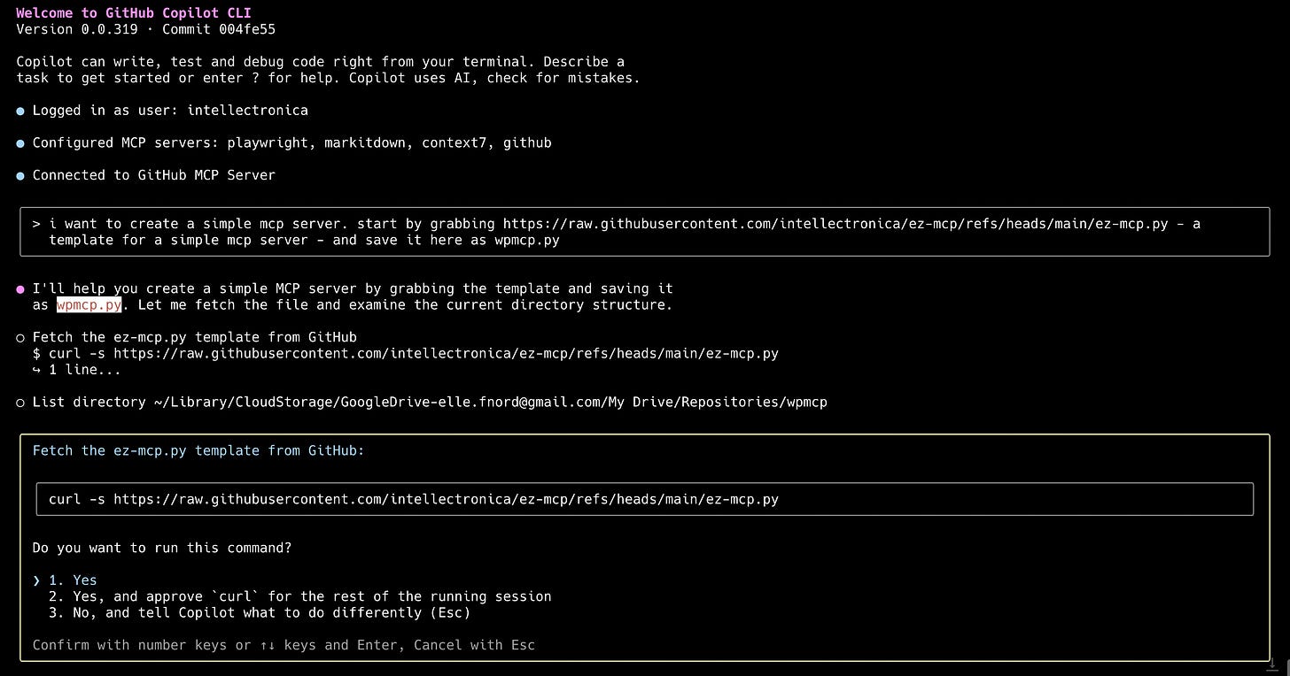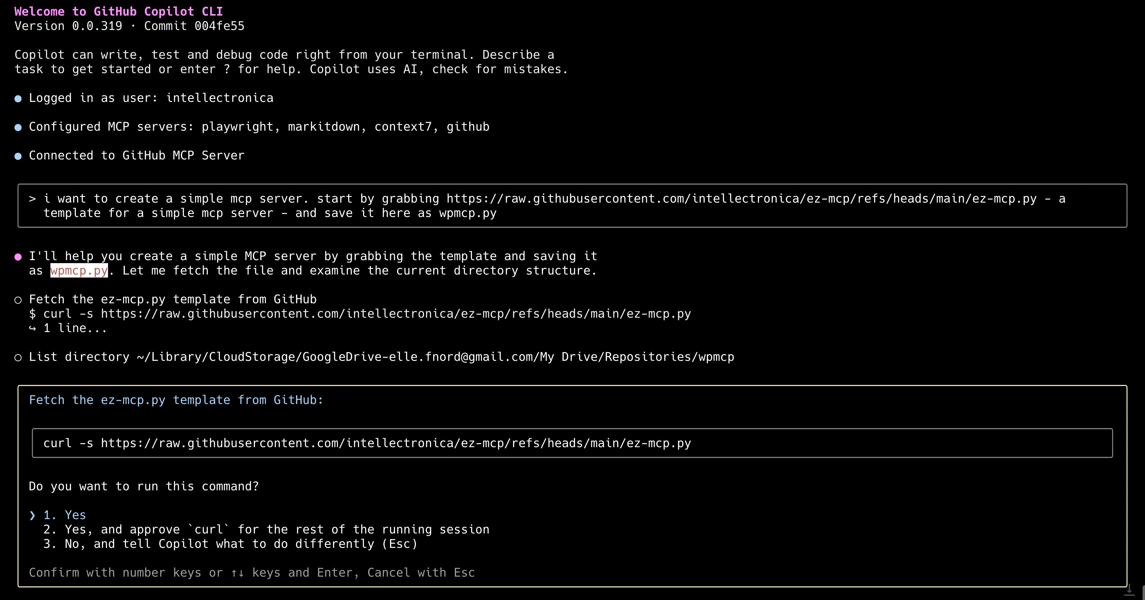 I asked the agent to download a Python MCP server template from my ez-mcp project on GitHub. It correctly identified the need for a curl command, presented it for my approval, and saved the file locally.