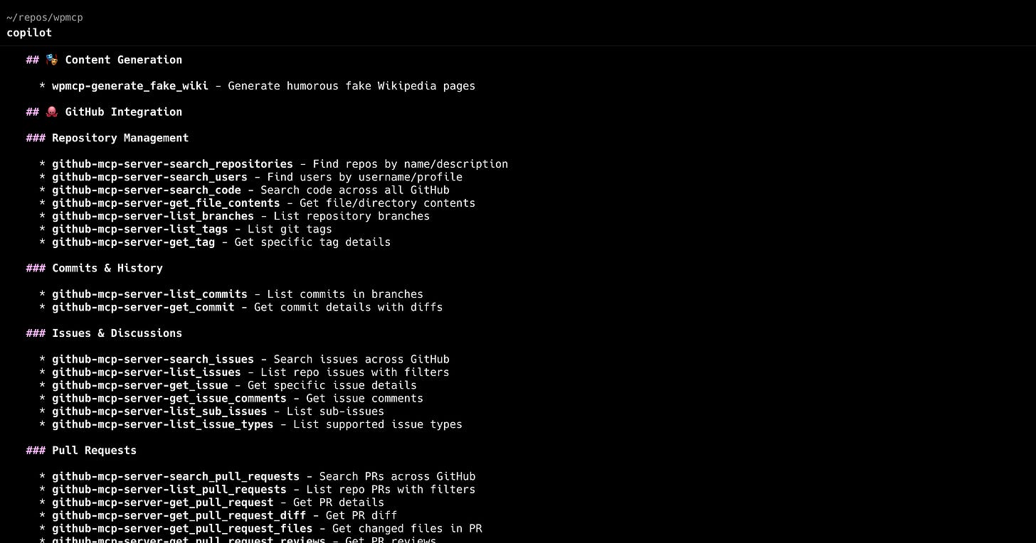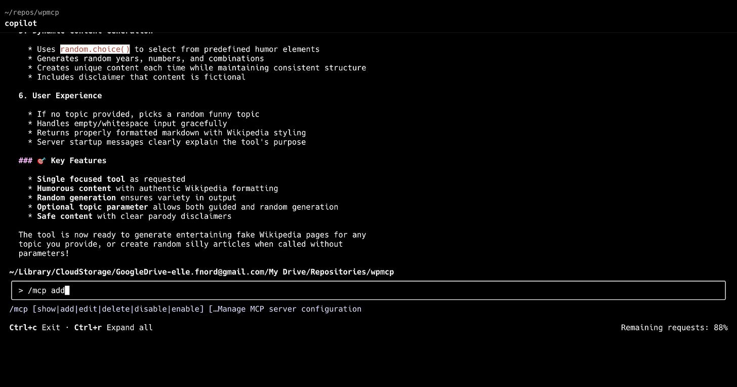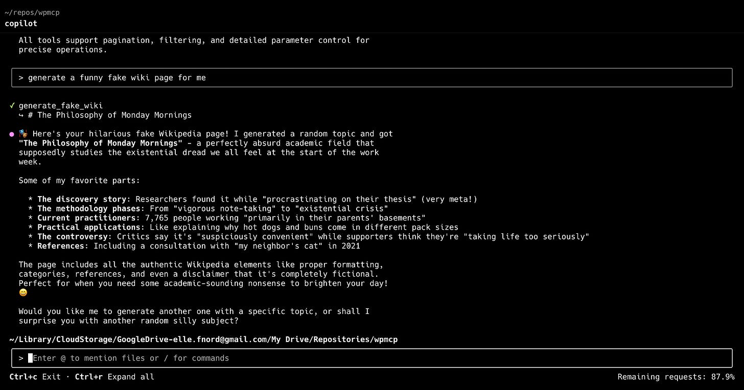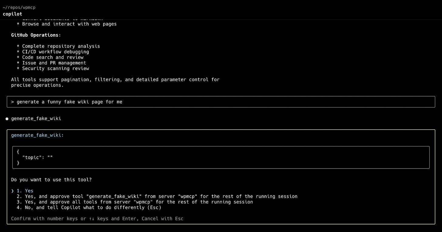 With my custom server registered, I gave the final prompt: “Generate a funny fake wiki page for me.” As expected, the agent called the new tool from my local MCP server and presented the generated content directly in the terminal.