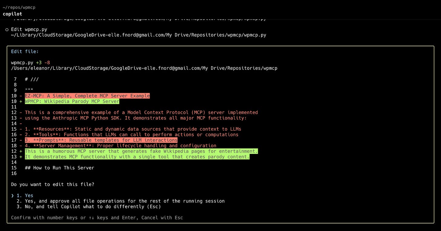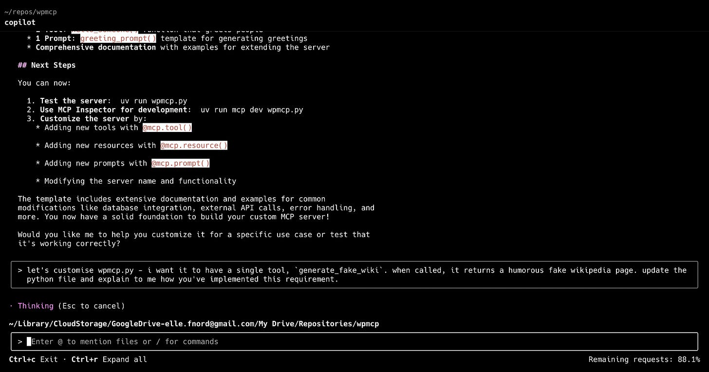 With the template file on disk, I prompted: “Customize this file to add a tool for generating a humorous, fake wiki page.” The agent read the file, understood its structure from the inline comments, and planned the necessary code modifications.