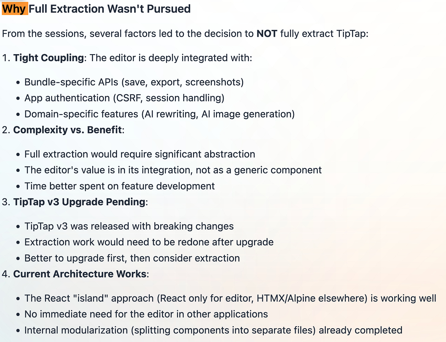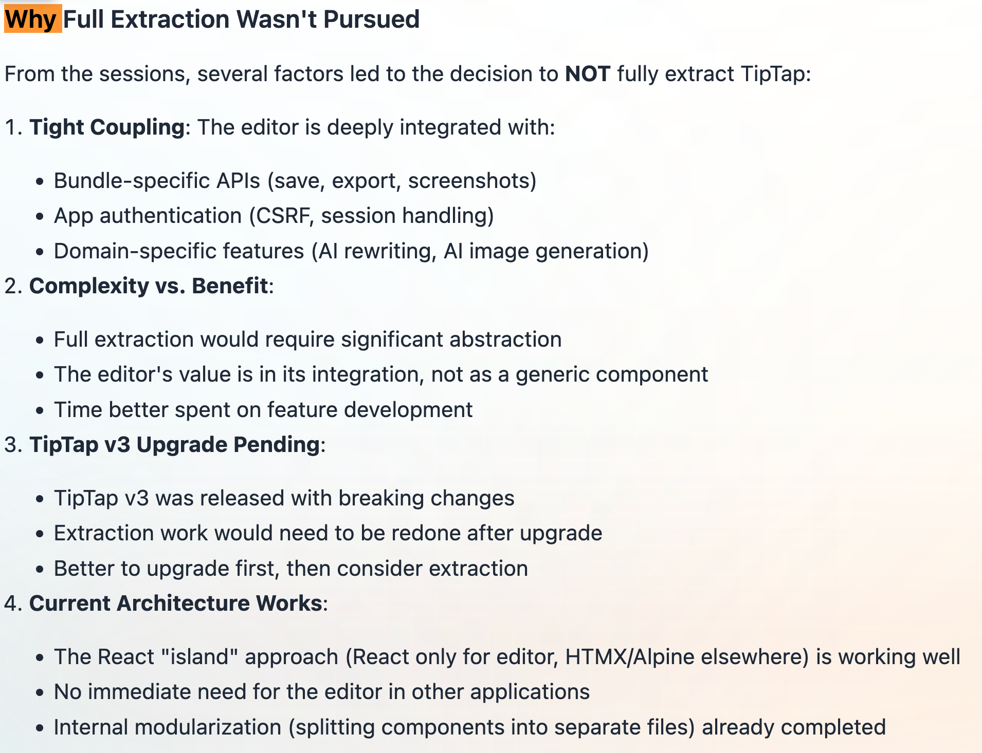 Pending Upgrade: We’re waiting for TipTap V3 before refactoring.