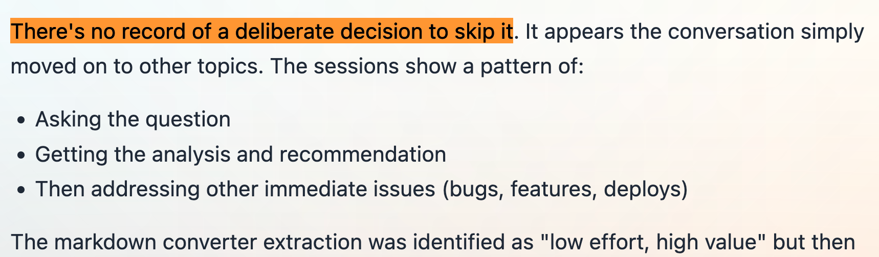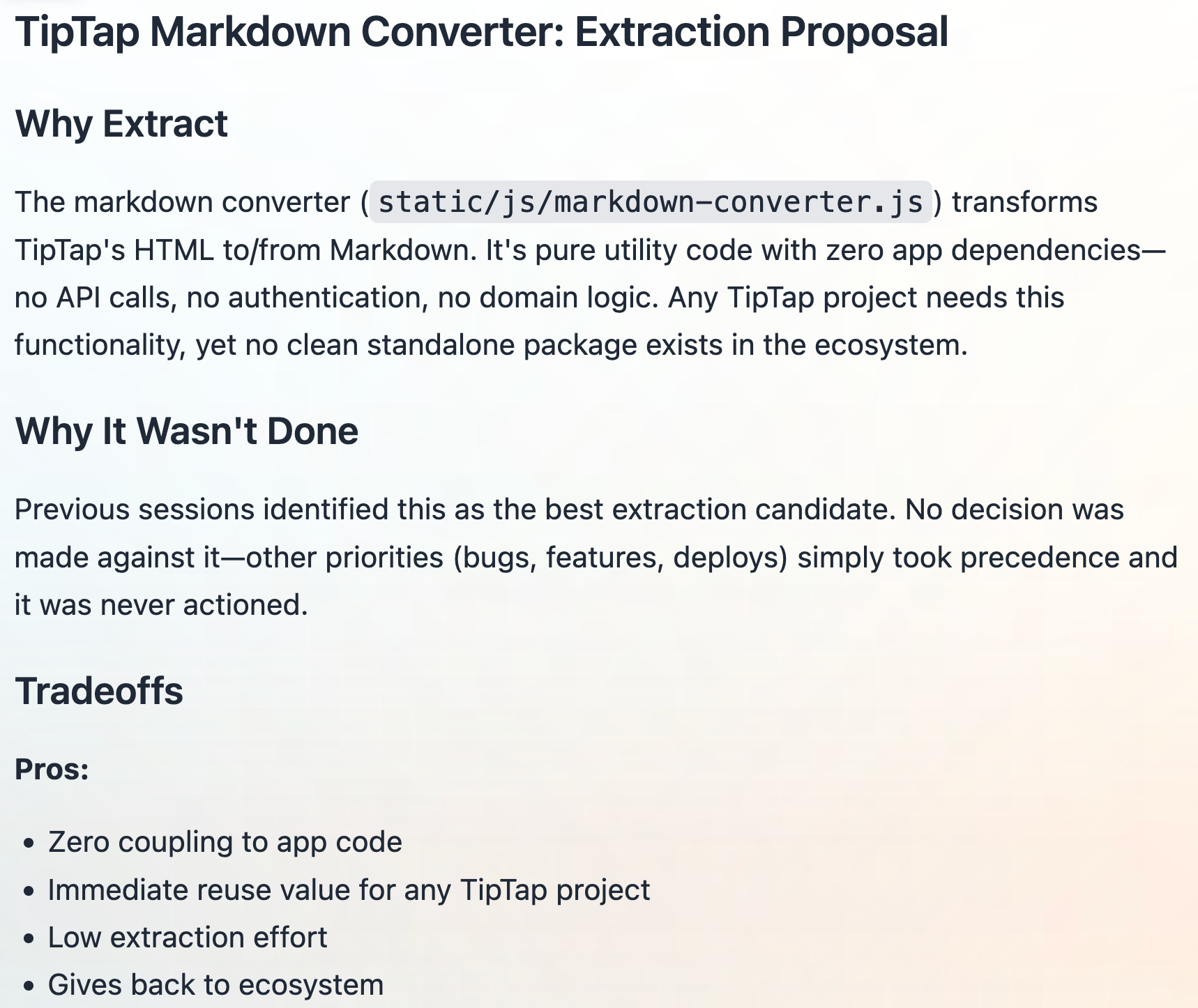 The analysis also found a missed opportunity: extracting the Markdown converter piece only.