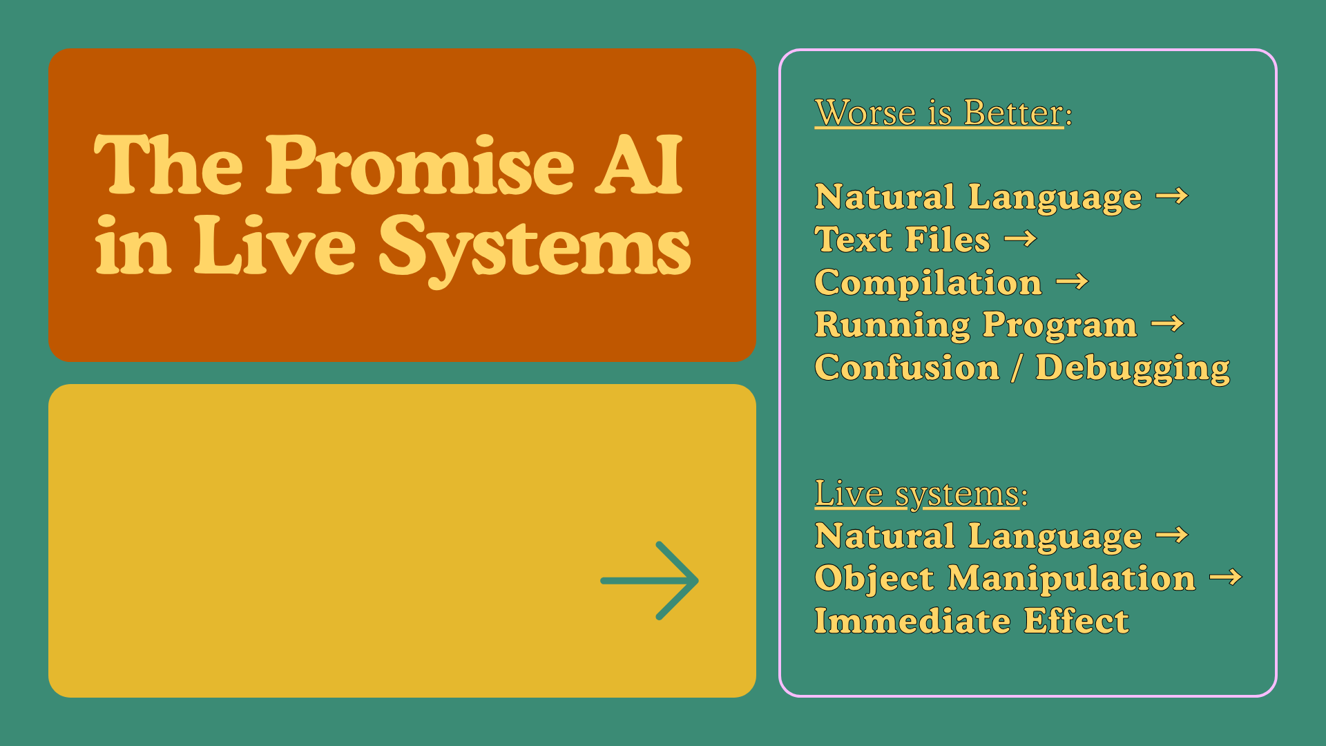 This is where live systems become relevant again. With traditional workflows, we go from natural language requirements to source code to compilation to running programmes. When confusion arises, we must understand source code to debug.