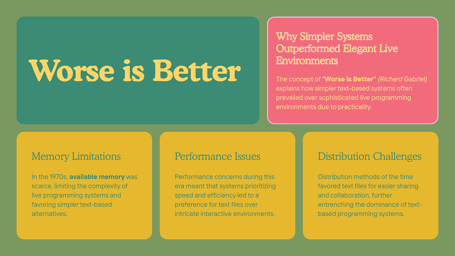 Despite their influence, these systems remained marginal. Richard Gabriel’s “Worse is Better“ essay explained how Unix, C, and text-file workflows won. The constraints of the 1970s-90s made live systems impractical: memory was scarce and expensive, performance was critical when every CPU cycle counted, and distributing multi-hundred-megabyte memory images was nearly impossible.