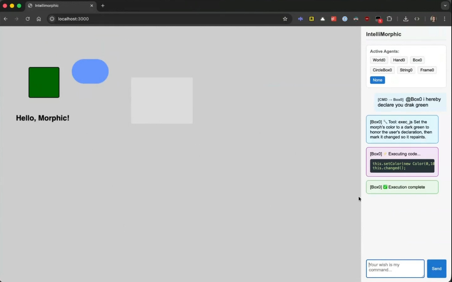 The box received the message, used its AI capabilities to determine it needed to set its colour property, and turned dark green. The crucial point: I wasn’t using AI with tools to modify things in the environment. I sent a message to the box, and it modified itself.