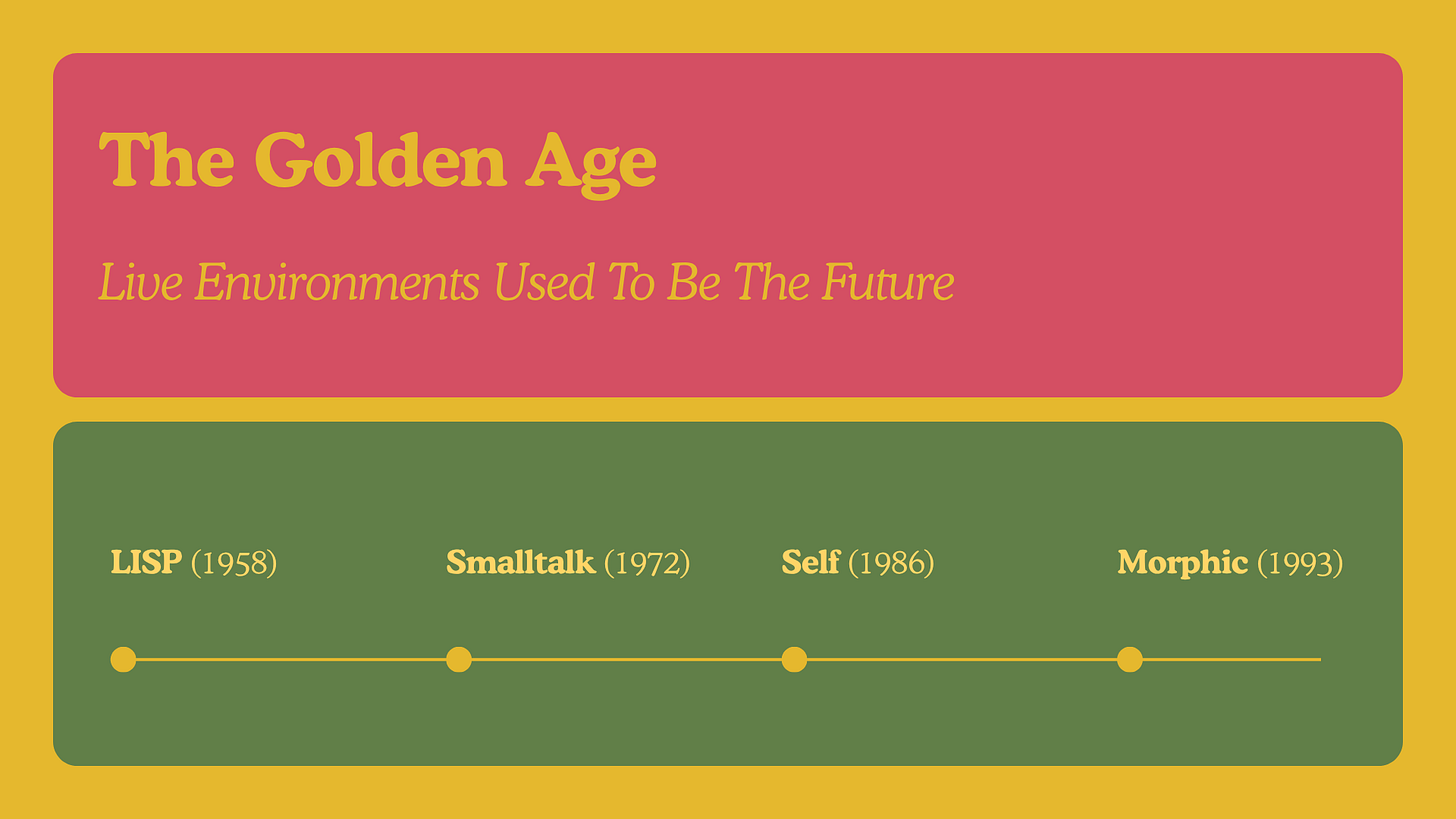 I provided context through a brief history of live programming environments stretching back to the late 1950s. LISP pioneered the insight that code and data could be the same thing, giving it unprecedented malleability and introducing the REPL — the first live environment where you manipulated objects directly rather than writing, compiling, and running programmes as separate steps.