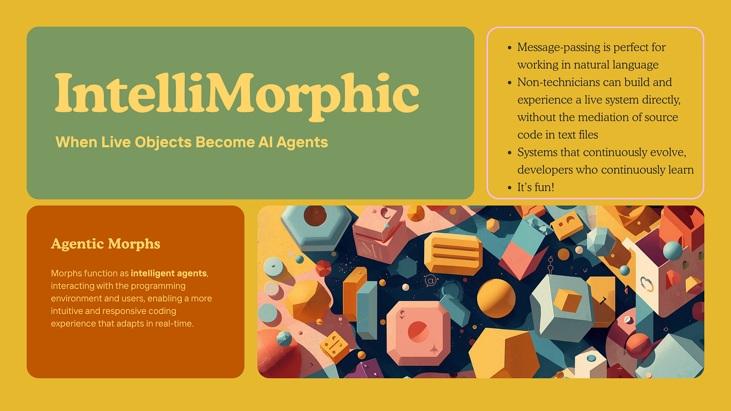 My experiment, IntelliMorphic, combines morphic.js (a JavaScript port of the original Morphic system) with AI agents. But rather than objects with just visual representation and code, each morph is an AI agent that communicates in natural language.