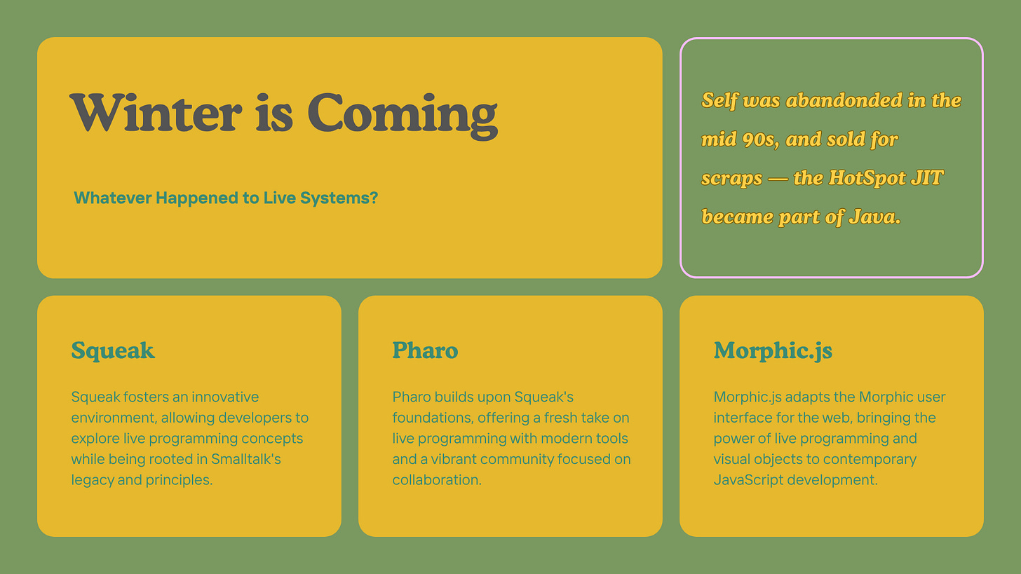 Smalltalk refined this with pure message-passing between objects, creating genuinely intuitive image-based development where everything in the running system could be directly modified. Self took it further with prototype-based objects and Morphic, a graphical environment where every object had direct visual representation.