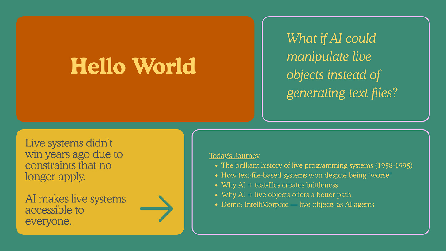 The technical foundation is sound. The programming paradigm I drew from — Morphic’s visual programming — has proven itself over decades. AI simply makes it accessible in ways it never was before.