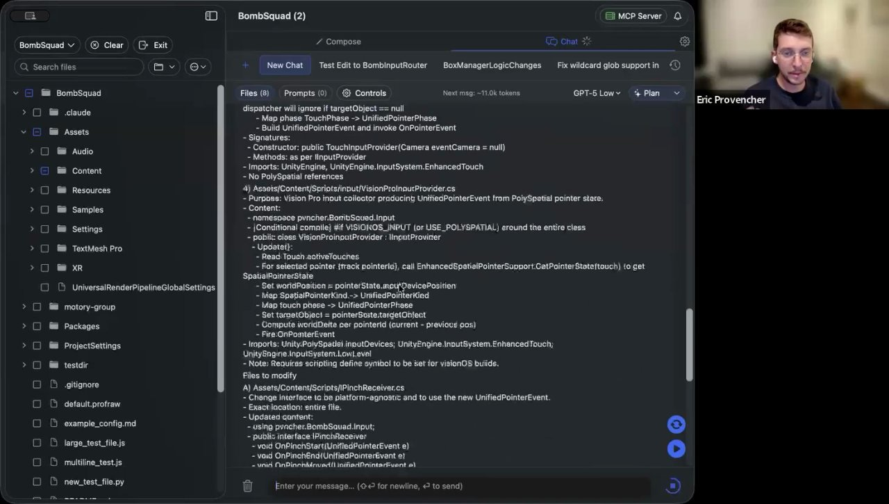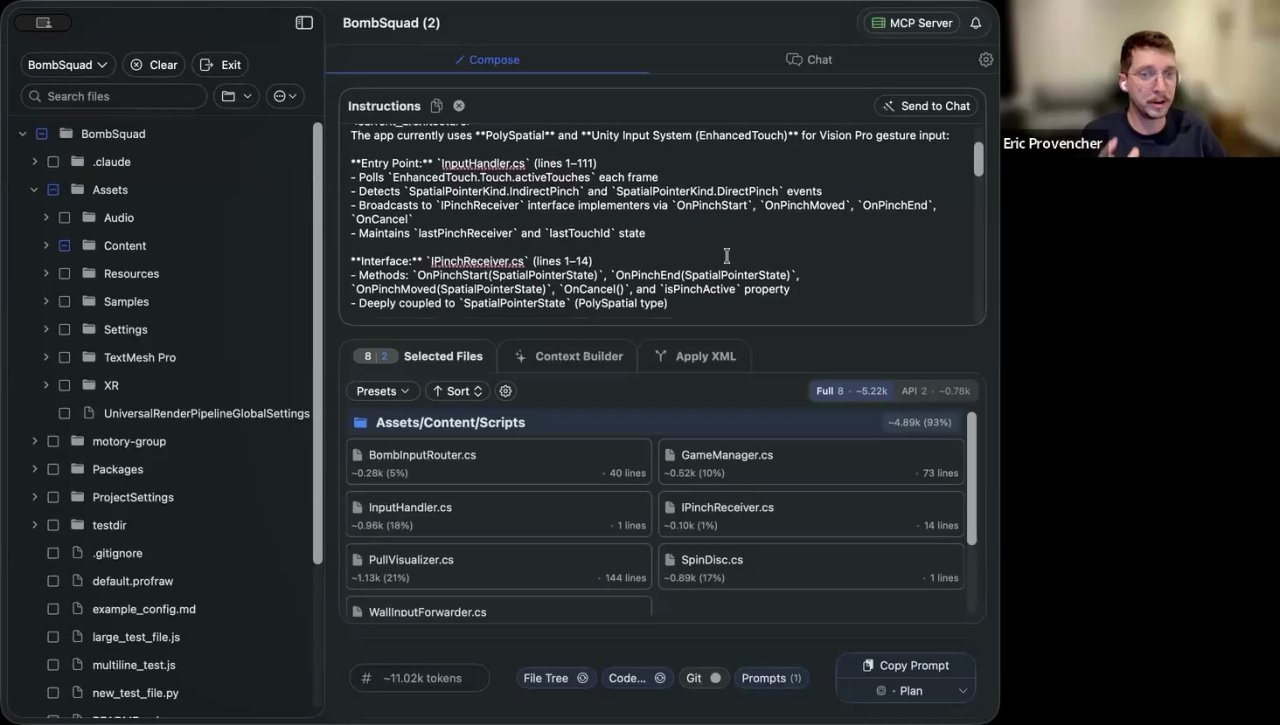 It starts with the Context Builder. [04:31] You begin with a simple, high-level task. In his demo, Eric wanted to refactor his game’s input system to handle touchscreen input for the Vision Pro.