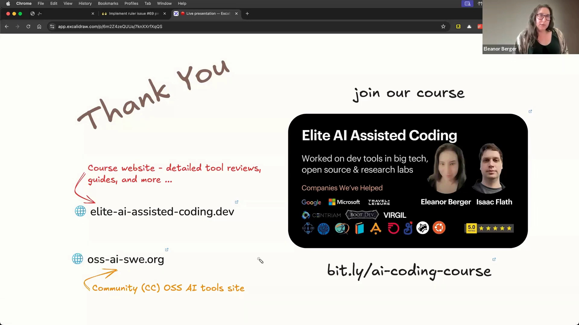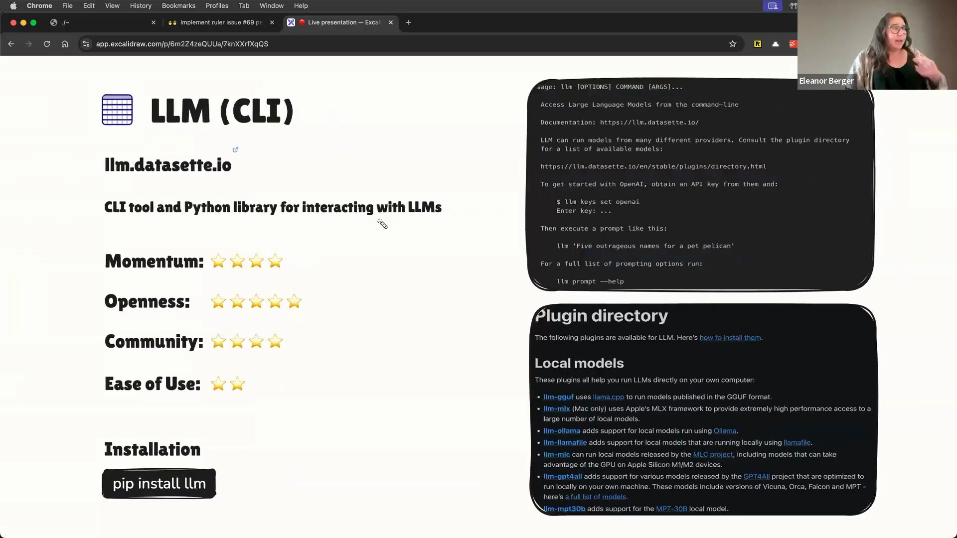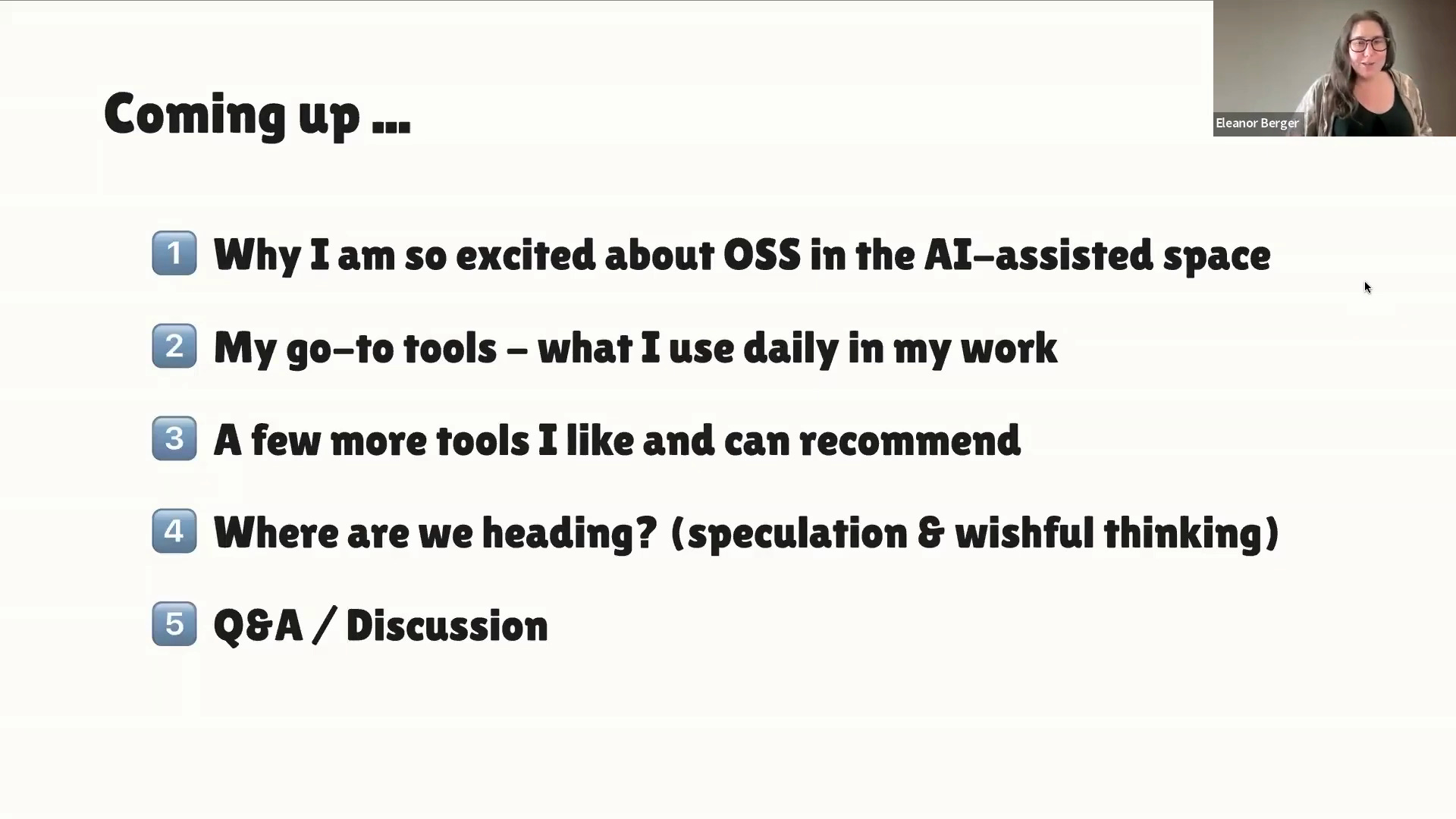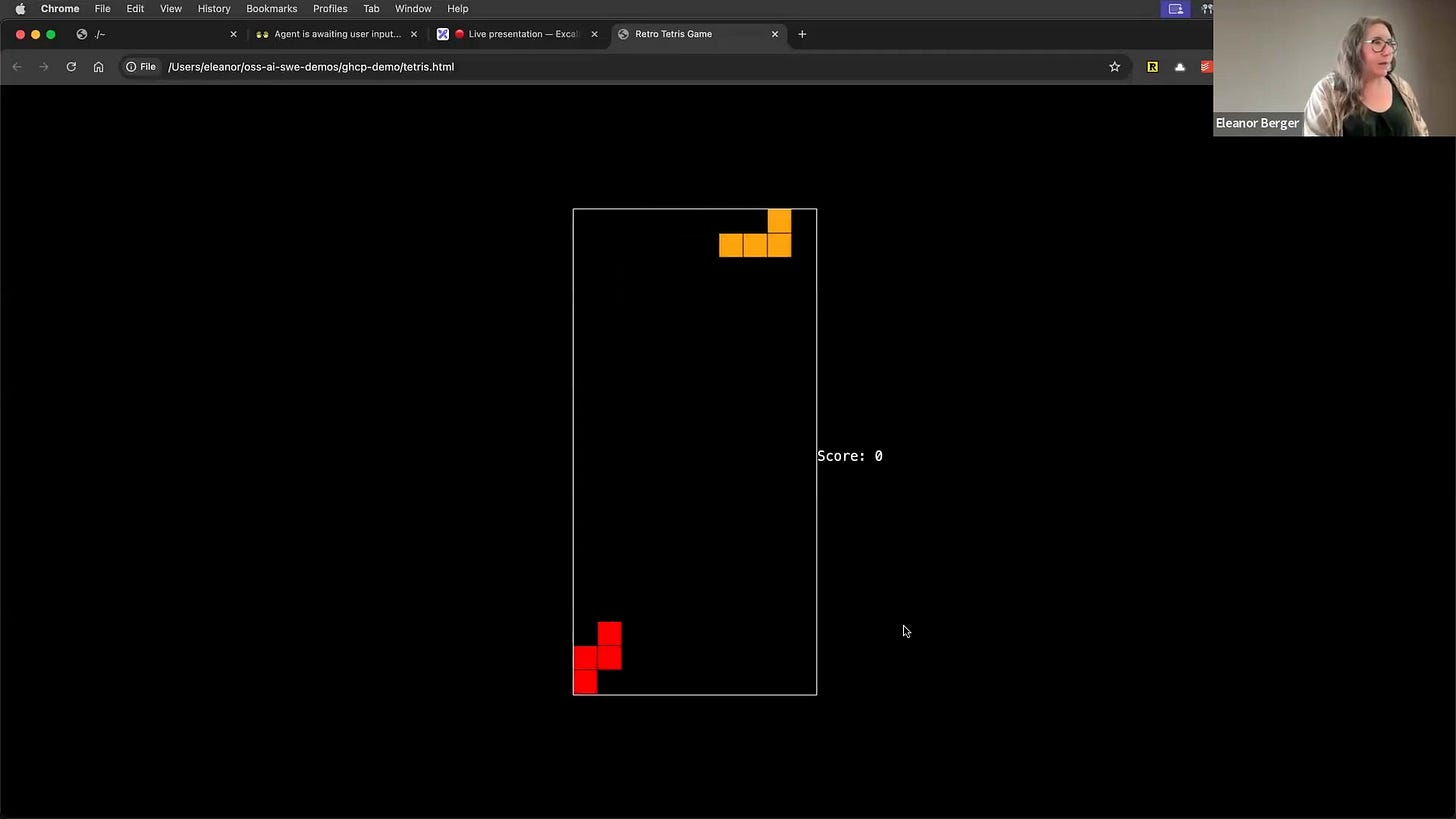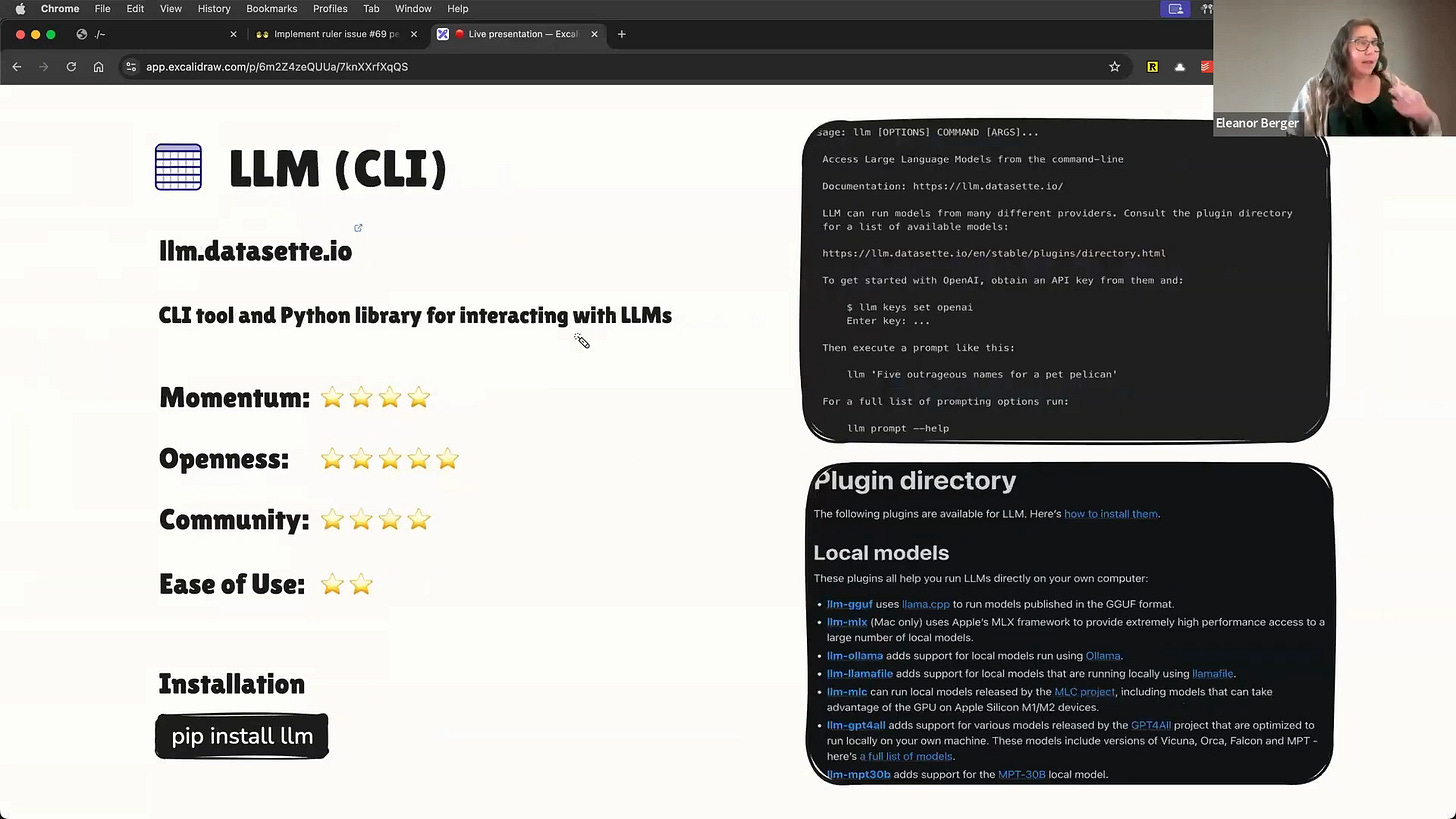 Eleanor and I are collaborating on a new course about AI-assisted coding, and many of the best practices and tools are rooted in the open source community [00:00:36]. While we use a mix of proprietary and open-source tools, open-source tools are critical for learning and adaptability. Eleanor started by coving why open source is important right now, and then moves to do a "cheese and wine tasting" of a few of her go-to tool, then does a Q&A.
