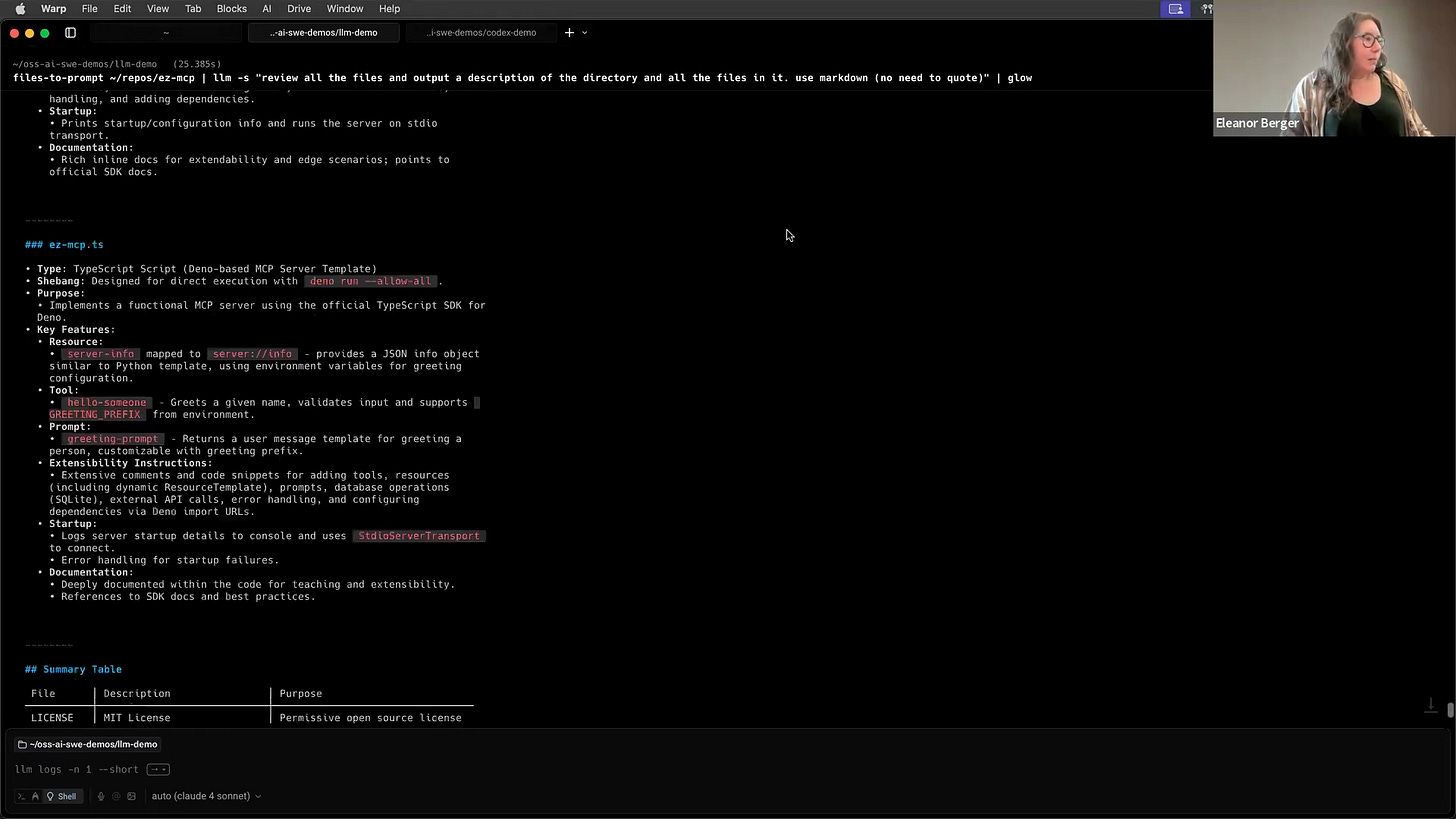 files-to-prompt . | llm -s "review all the files and output a description of everything and use markdown" | glowI provide a system prompt asking it to review the files and generate a markdown description. The output is then piped into glow for nice formatting in the terminal [00:25:18]. Behind the scenes, it makes a single API call to GPT-4.1 with the giant context and returns a clean, structured analysis of my project directory. It's incredibly useful for these kinds of ad-hoc tasks.