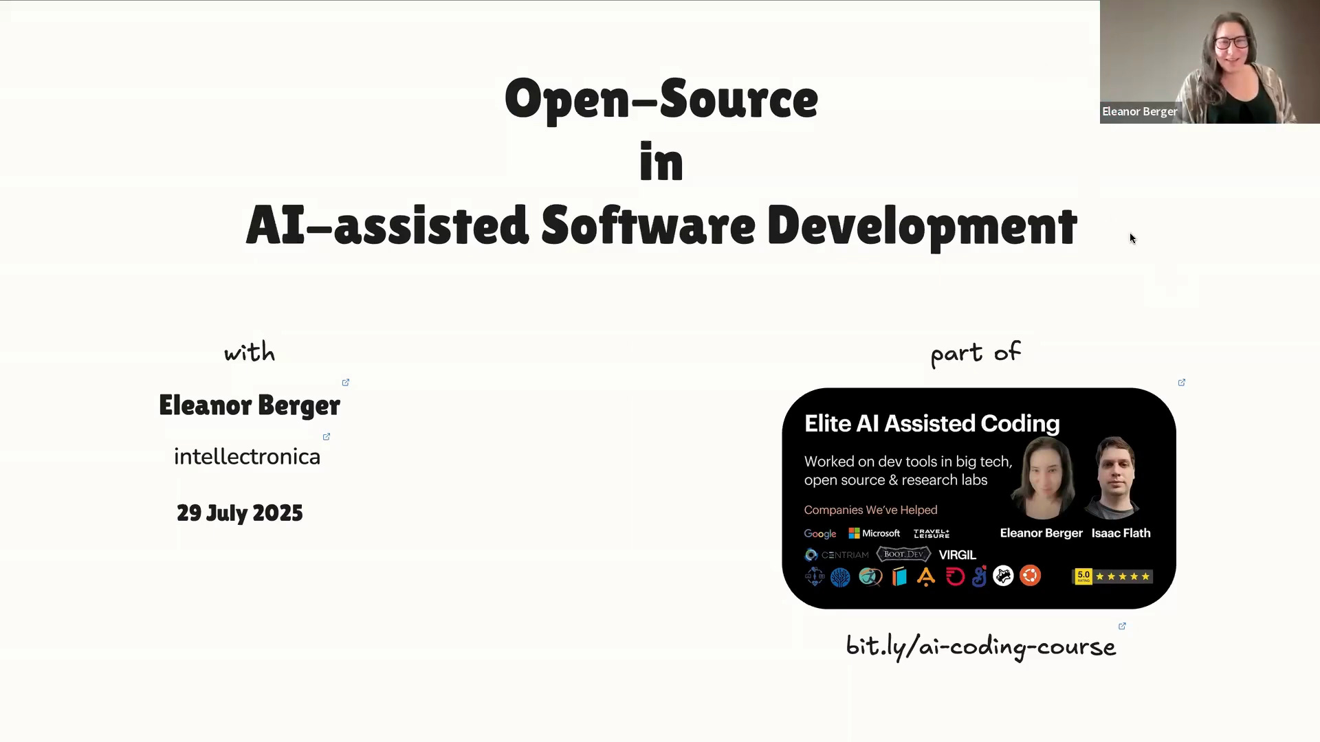 Eleanor gave a talk about a topic that's very close to our heart: open source in AI-assisted software development [00:01:42].