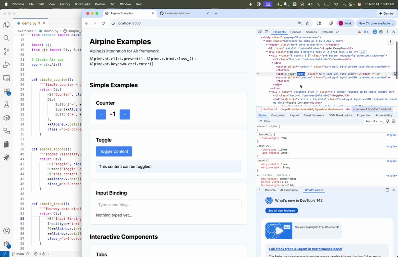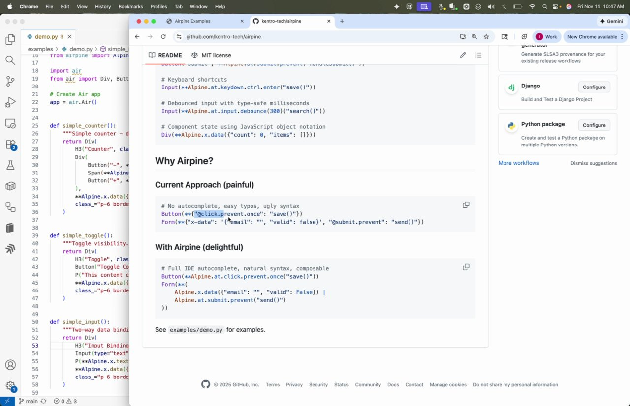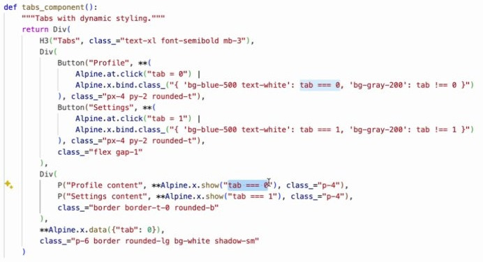 Using Alpine.js in Python can feel a bit clunky. If you’ve ever worked with a framework like air , dash, or fasthtml that generates HTML from Python objects, you’ve probably written code that looks like this: