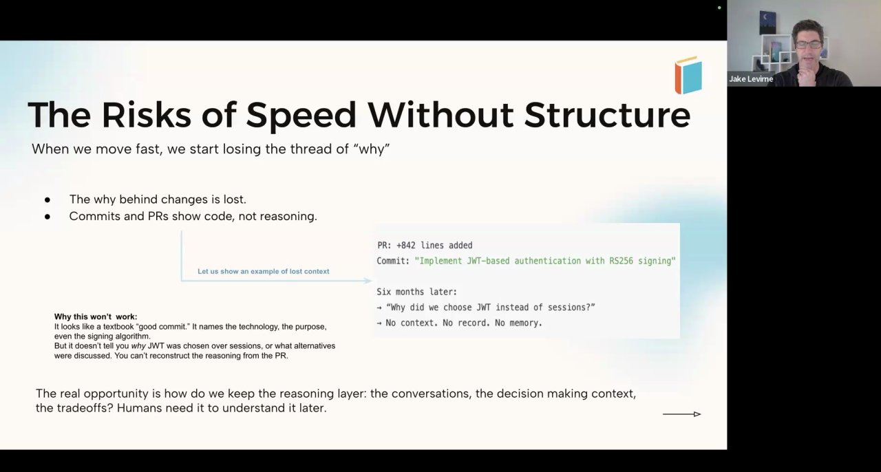 The code is there, committed to Git, but the conversation, the trade-offs, the discarded ideas, and the subtle decisions that led to that specific implementation are gone. As Jake put it, when you don’t preserve the intent, you “run the risk of losing the why behind the code” [03:41].