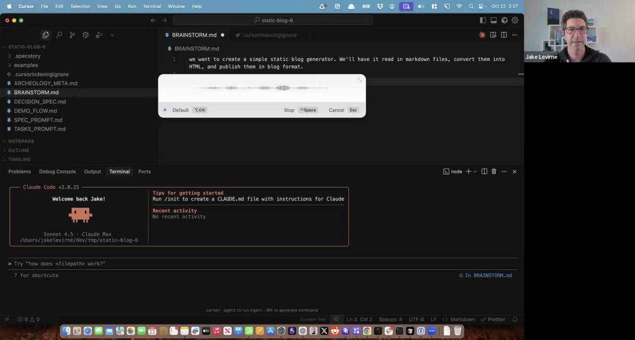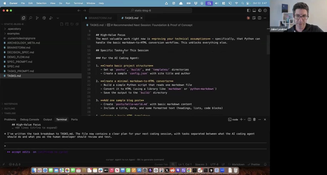 It begins with a brainstorm.md file. This is a free-form brain dump. The goal is to get all the initial thoughts down without structure. Jake used a voice-to-text tool to talk through the initial idea: create a simple static blog generator that reads Markdown files and converts them to HTML [05:50].